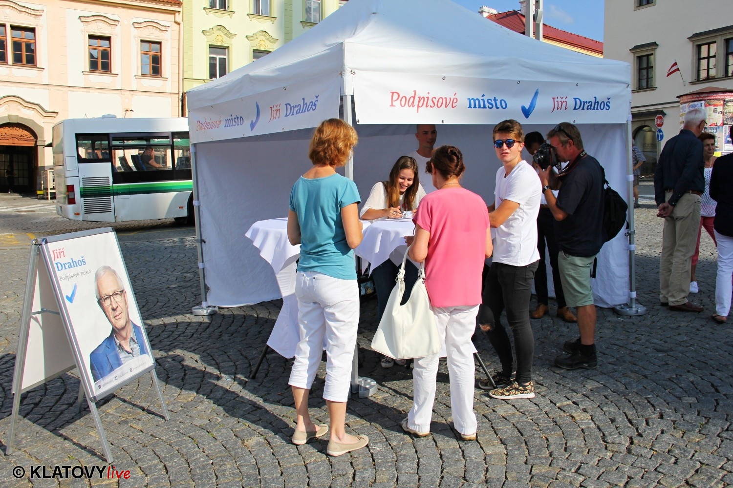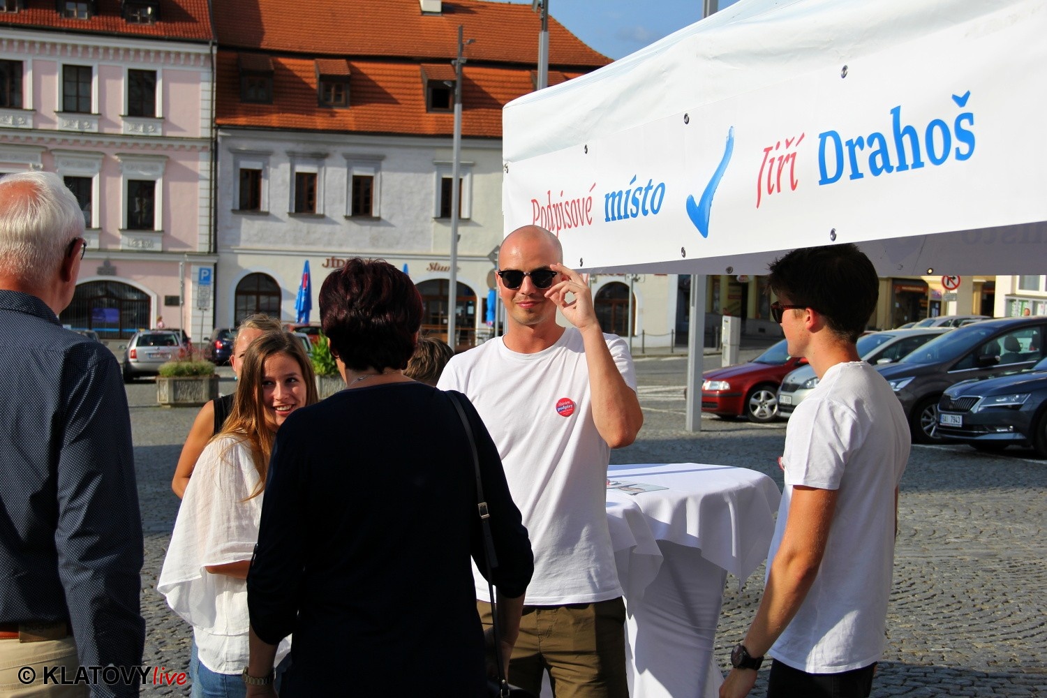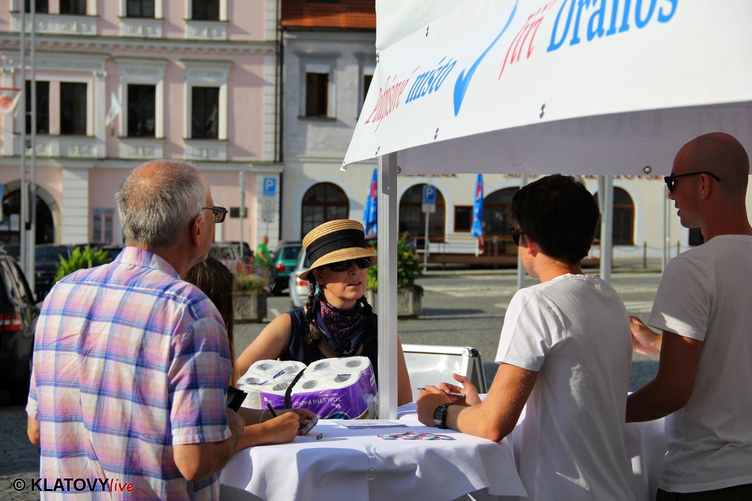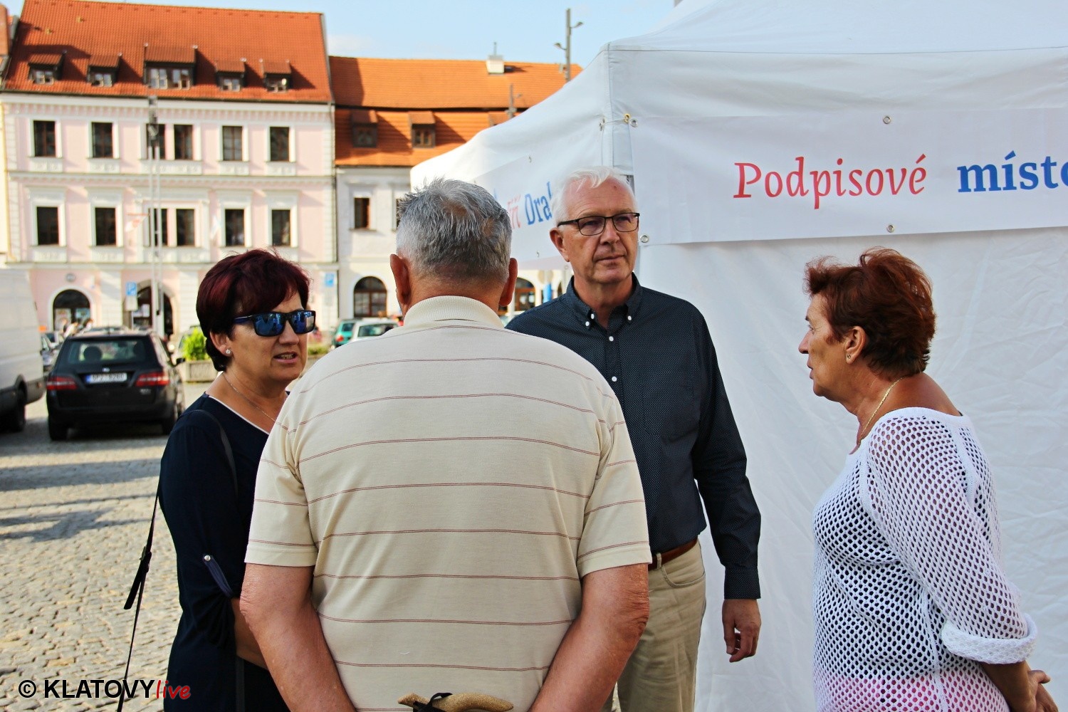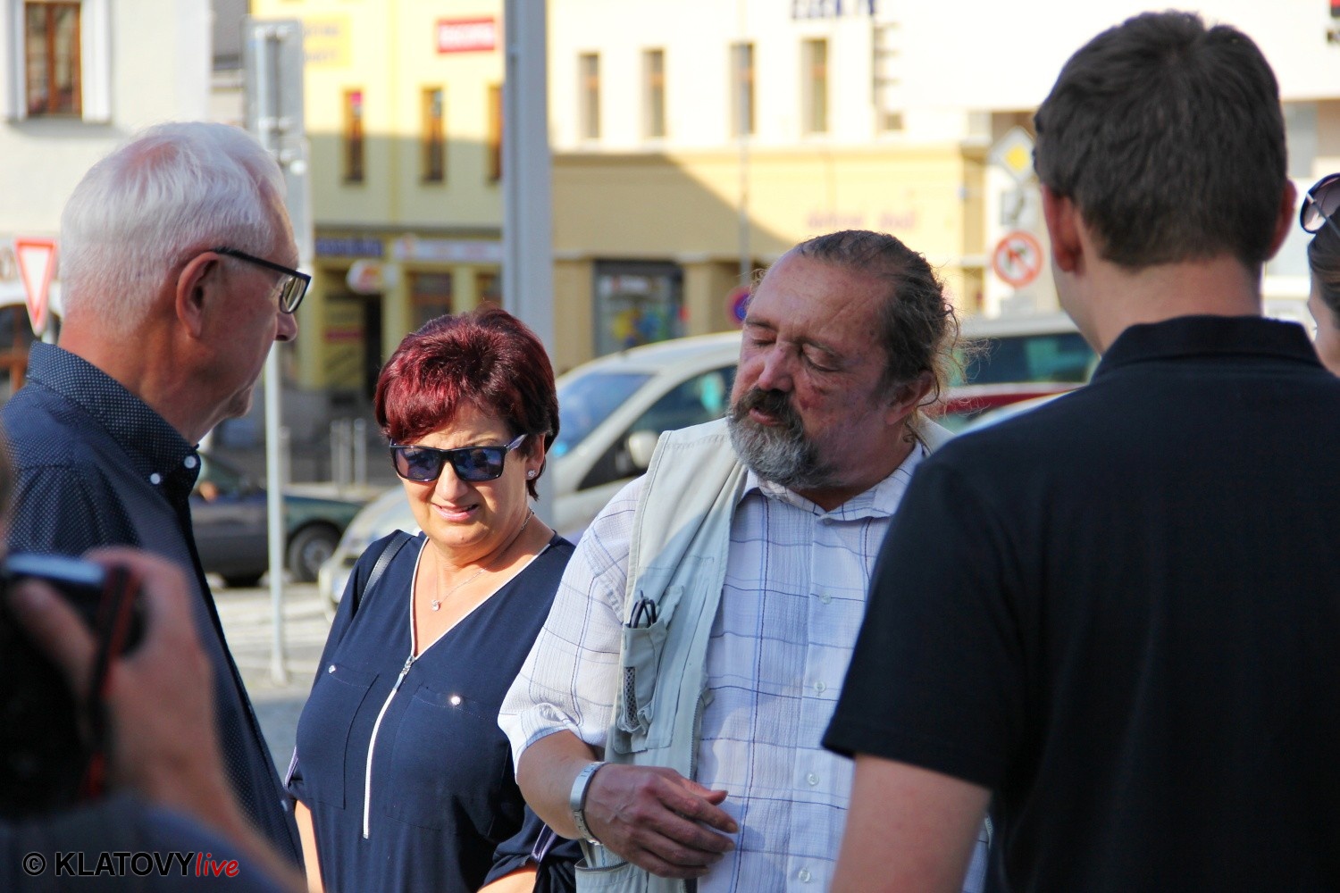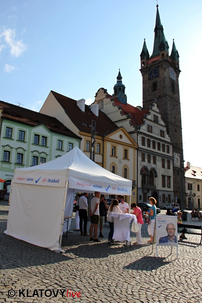 Podpisové místo pro sběr podpisů potřebných pro případnou kandidaturu na klatovském náměstí Míru a následná beseda s občany v Hotelu Rozvoj v Klatovech.