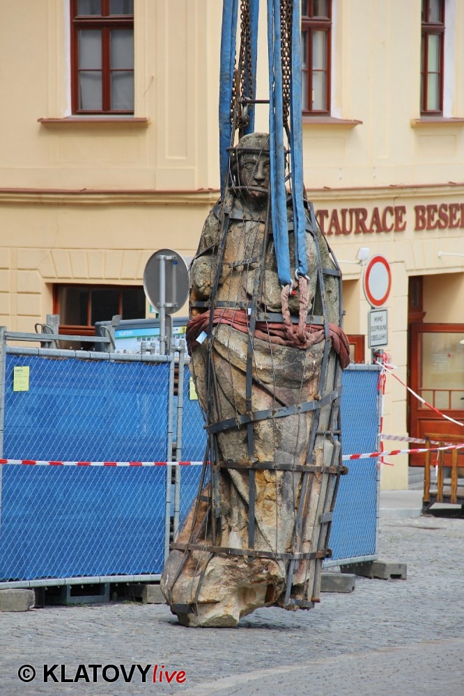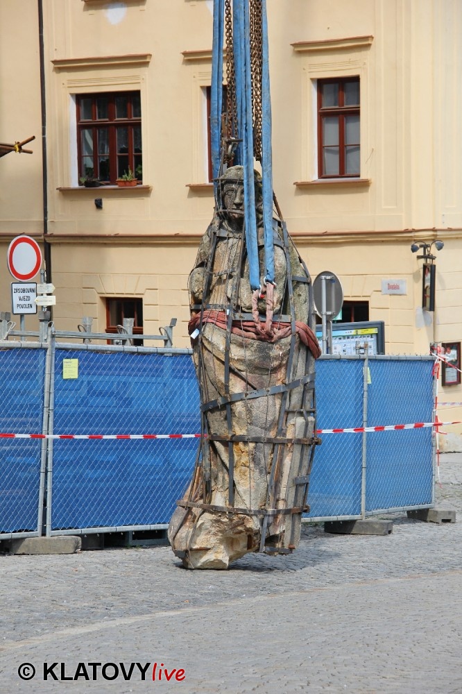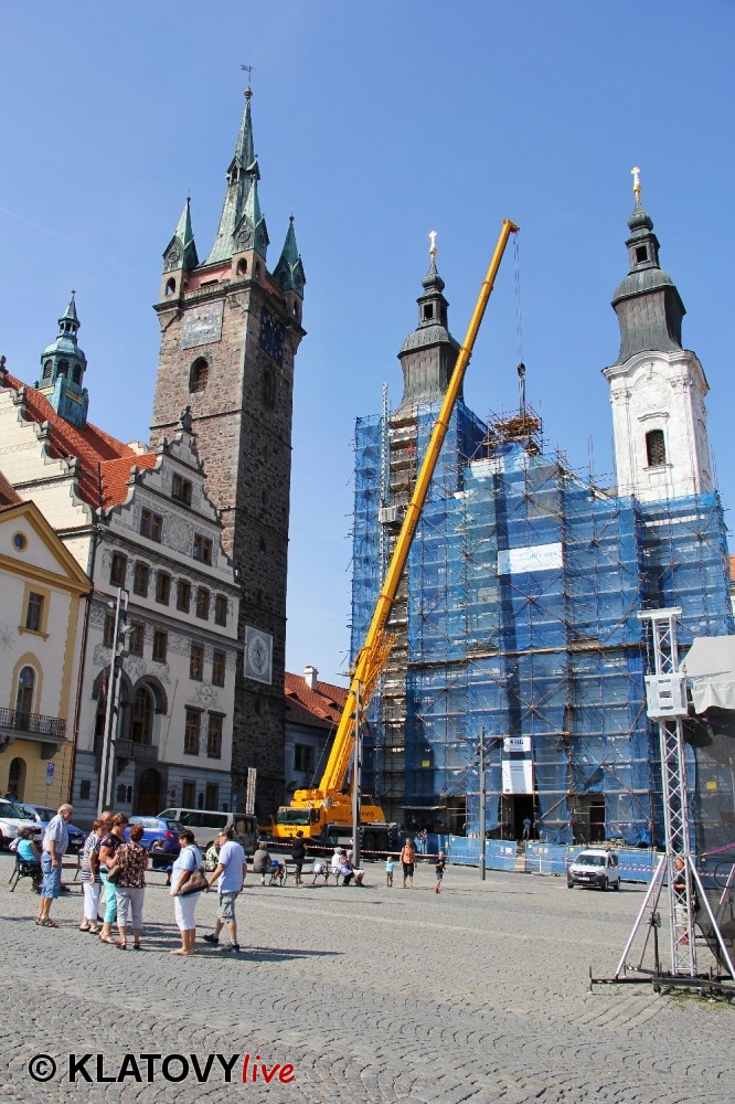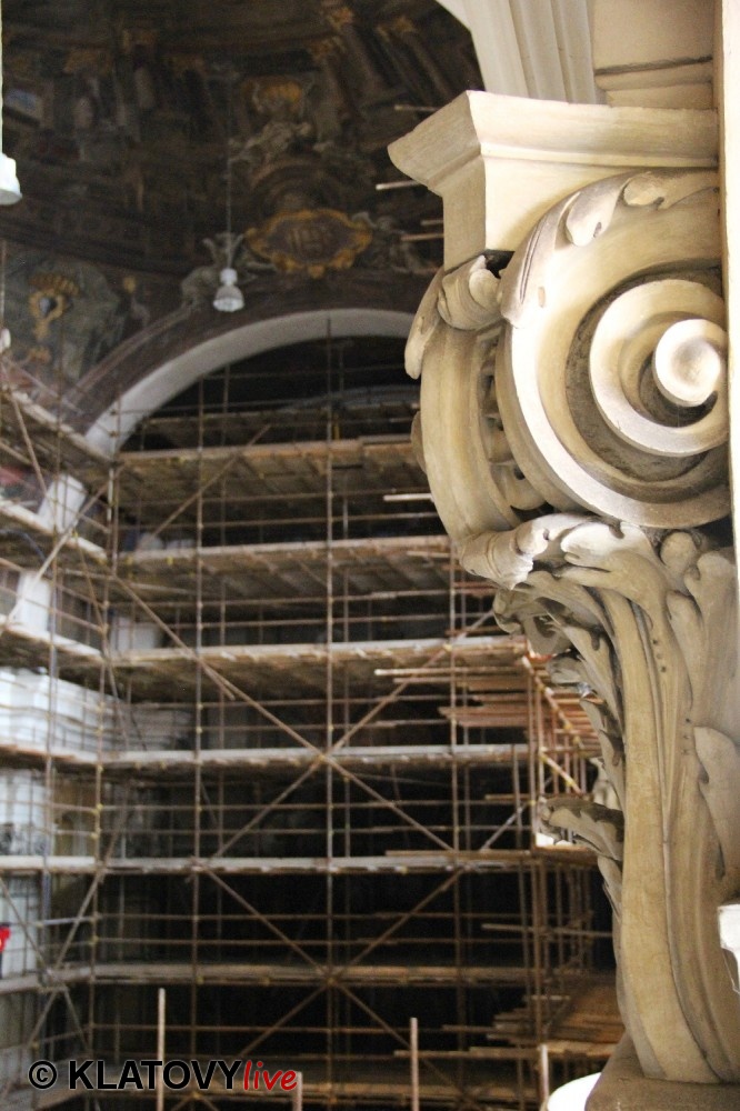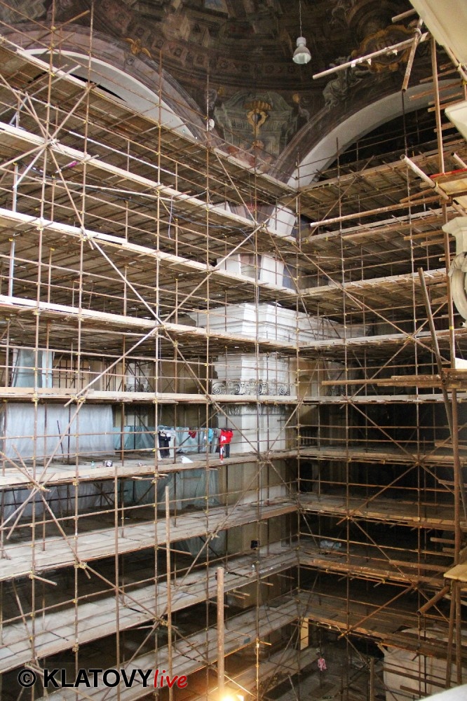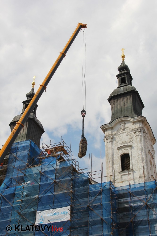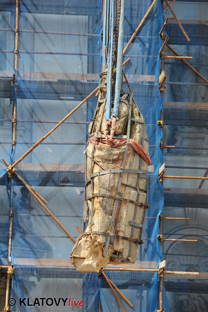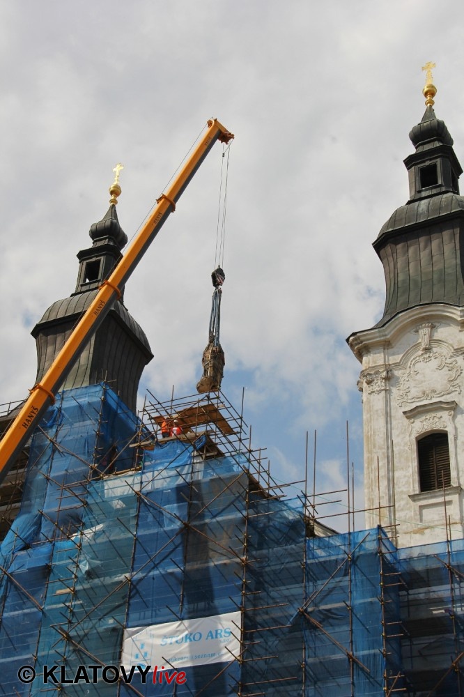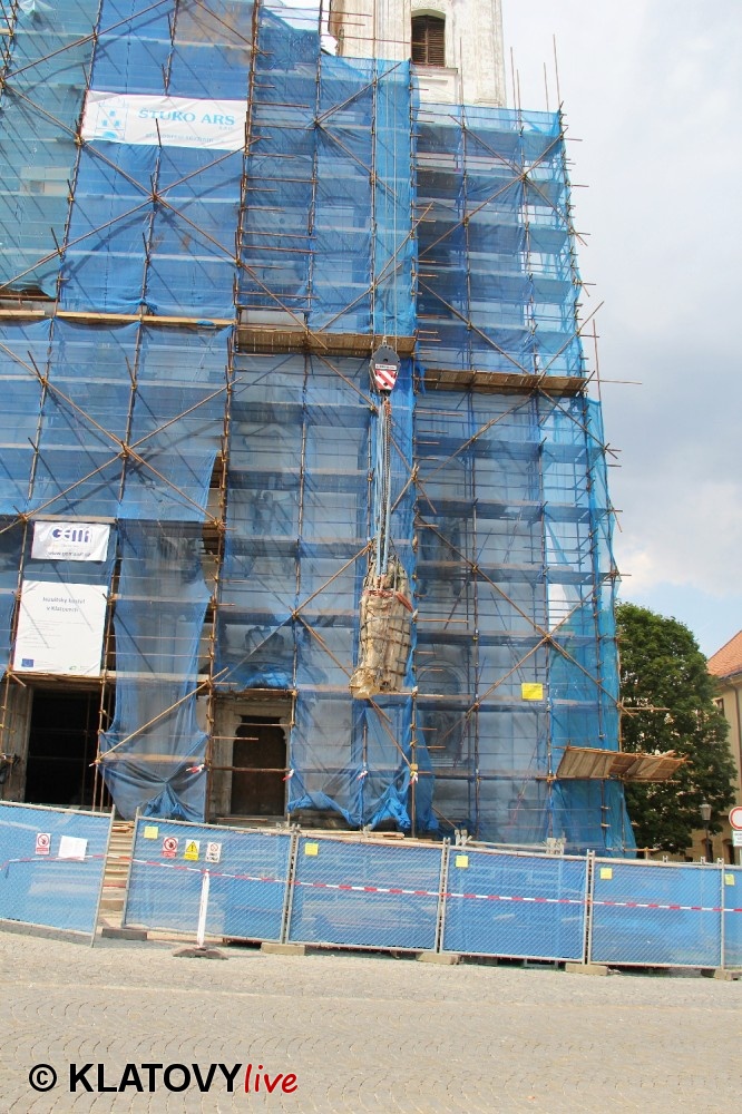 Z průčelí Jezuitského kostela na náměstí Míru v Klatovech byla snesena socha Panny Marie v rámci rekonstrukce kostela. O kompletní rekonstrukci svědčí i fotky lešení v interiéru.