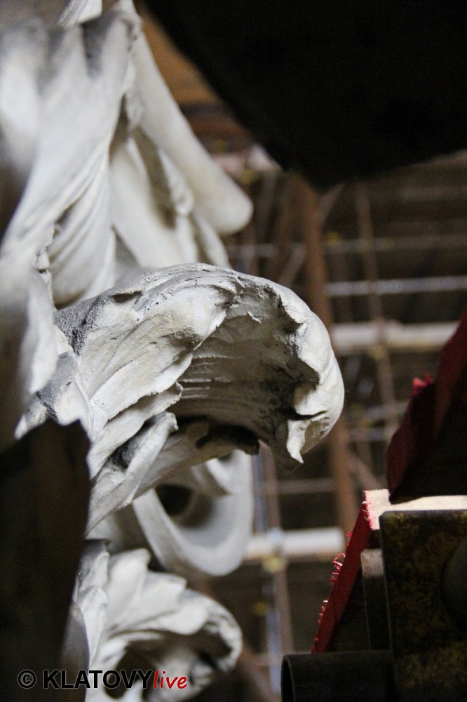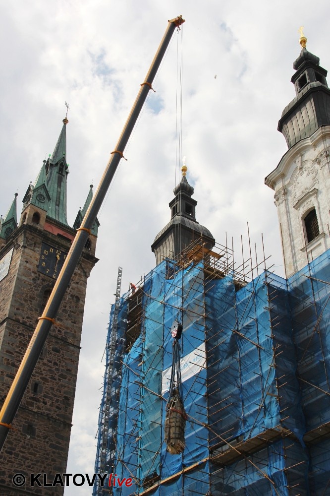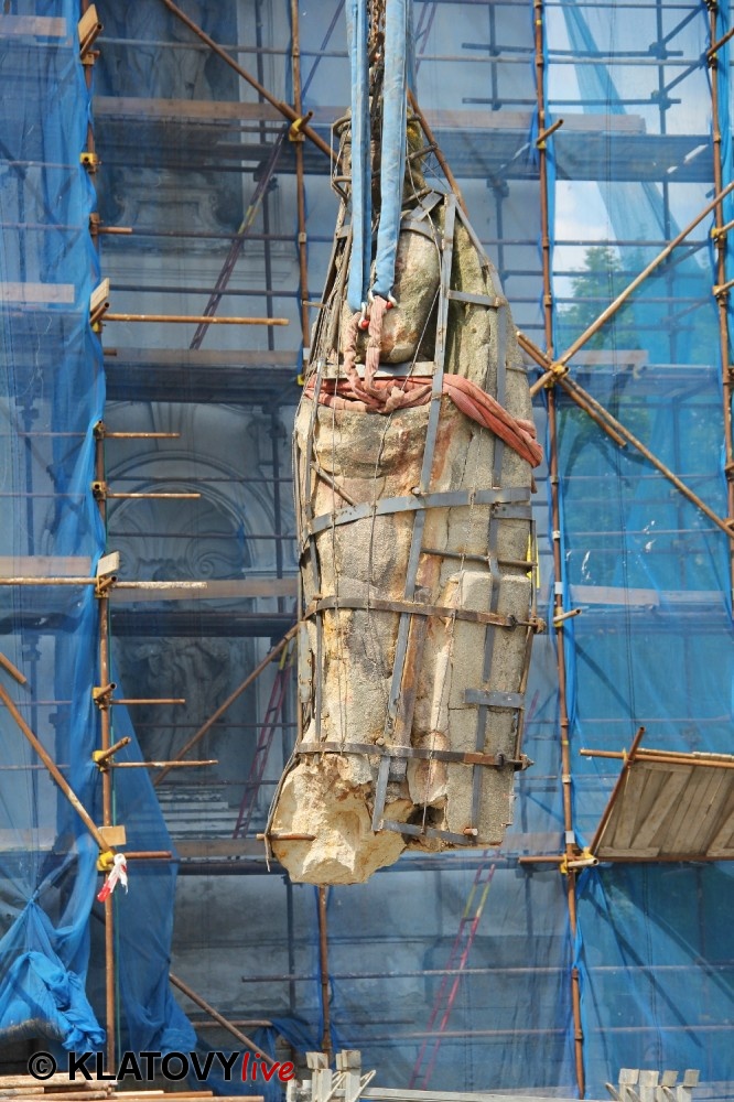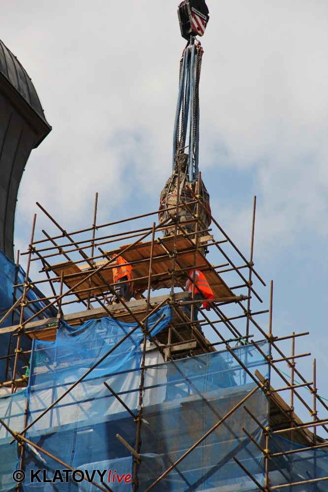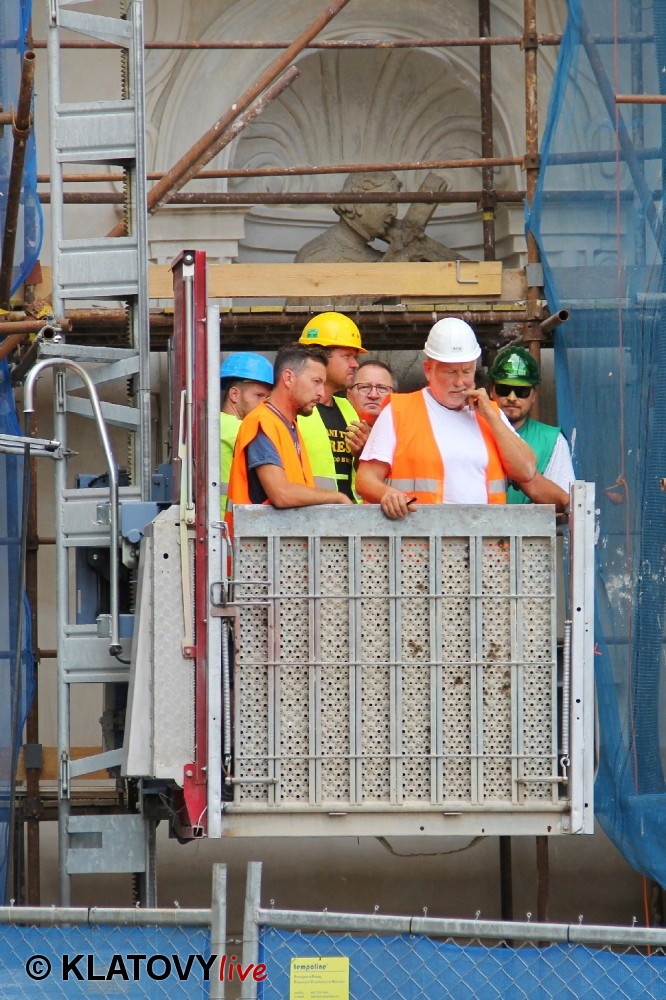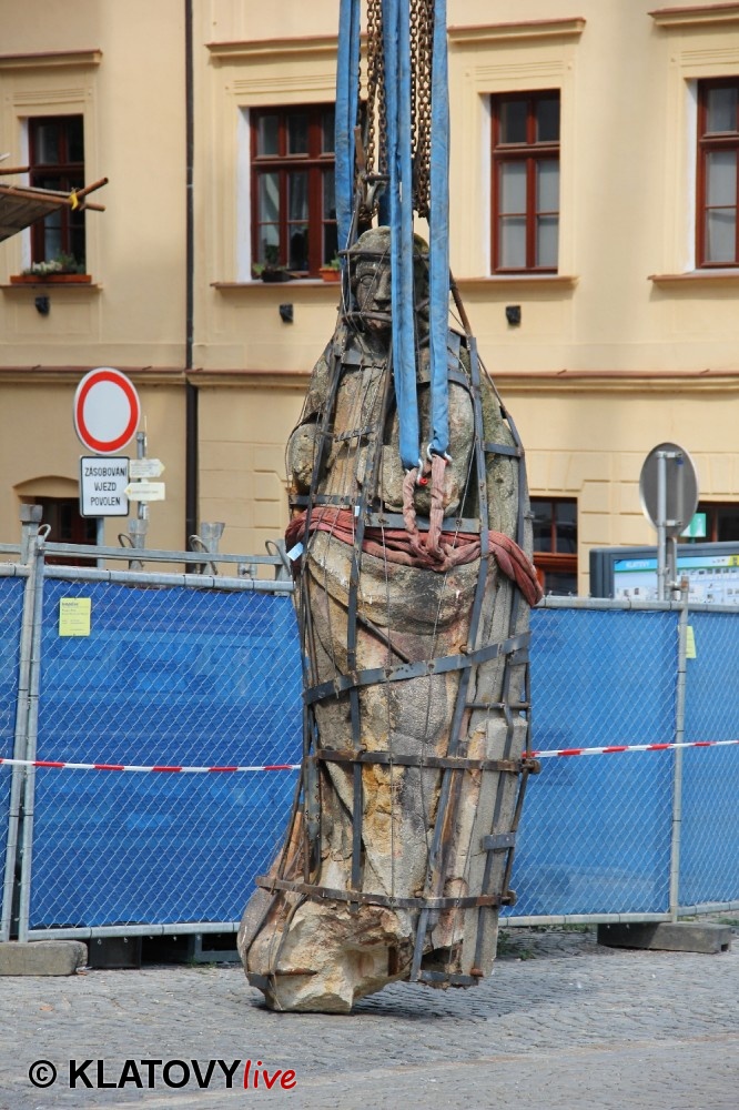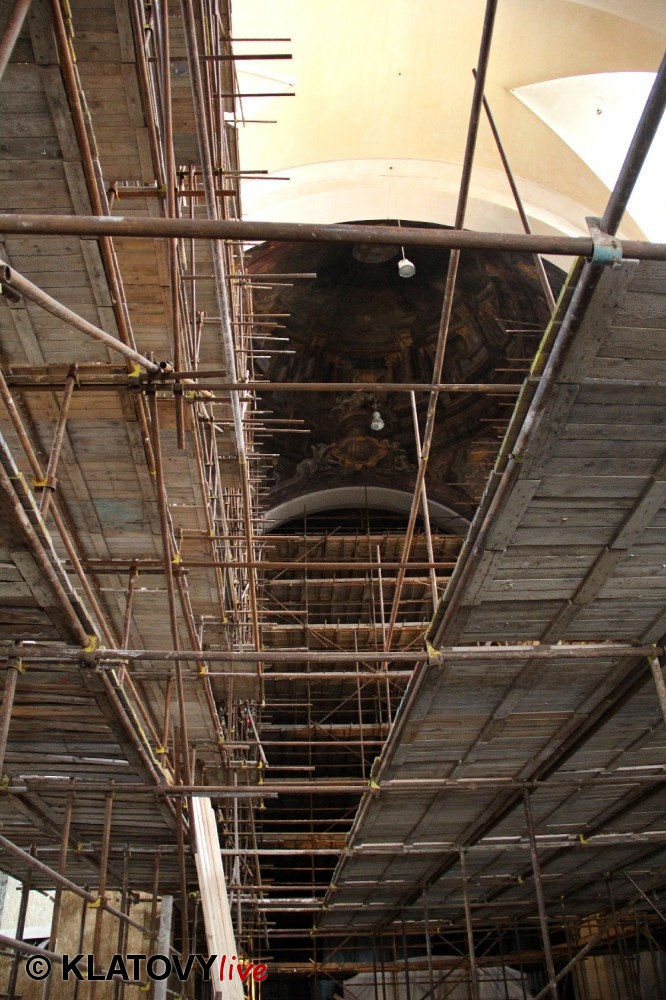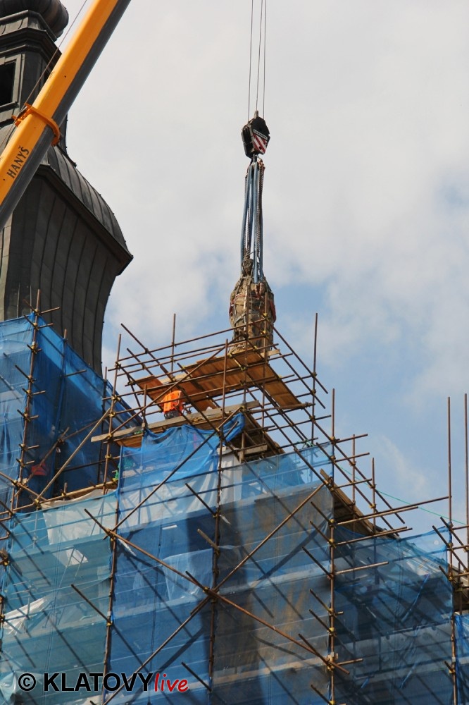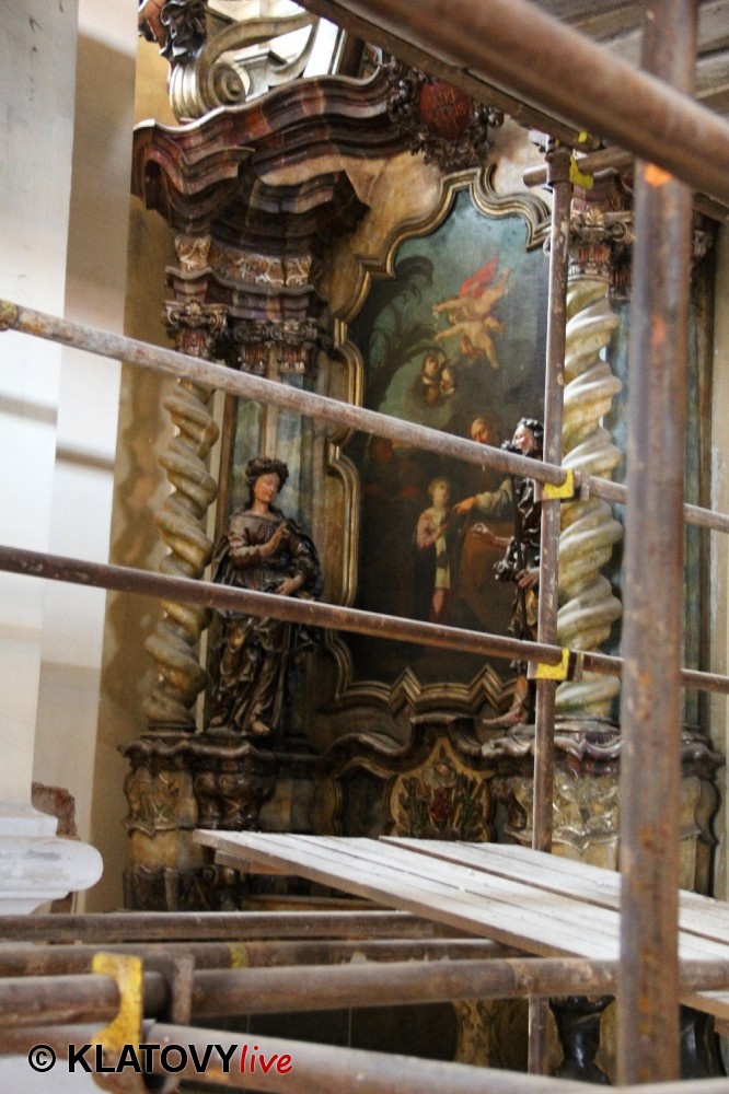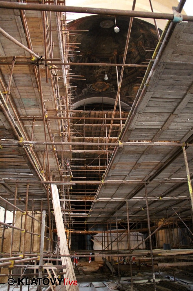 Z průčelí Jezuitského kostela na náměstí Míru v Klatovech byla snesena socha Panny Marie v rámci rekonstrukce kostela. O kompletní rekonstrukci svědčí i fotky lešení v interiéru.