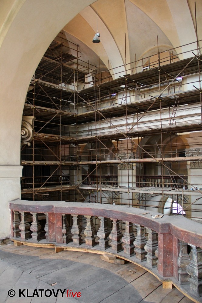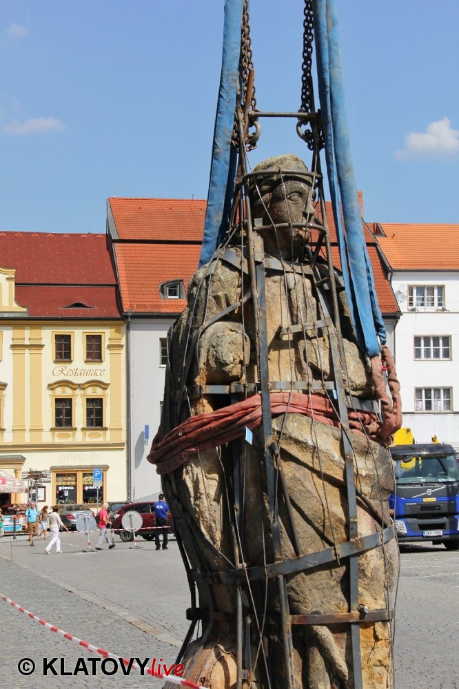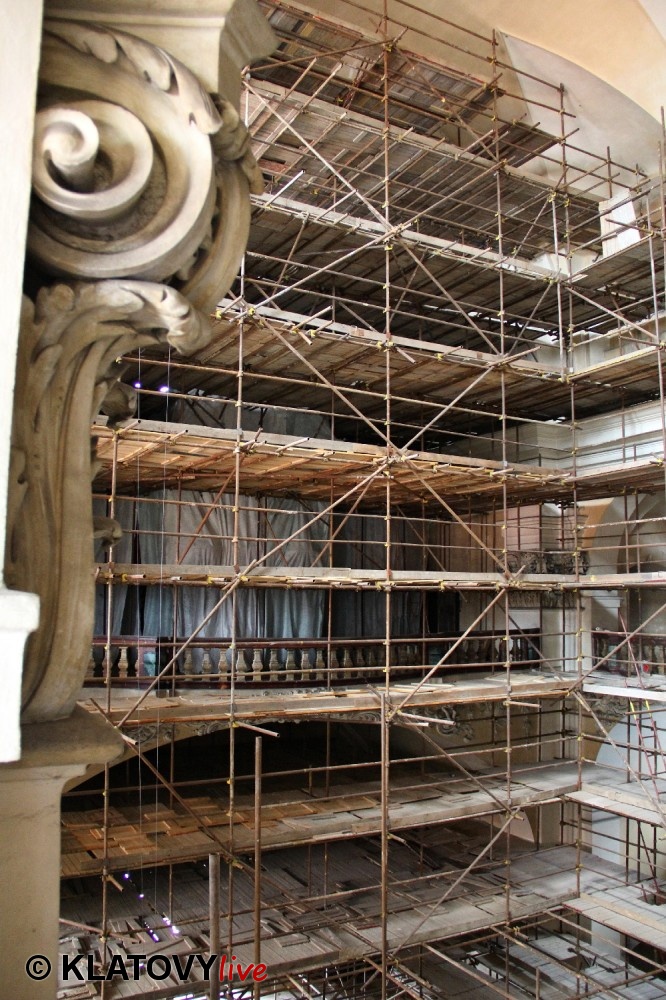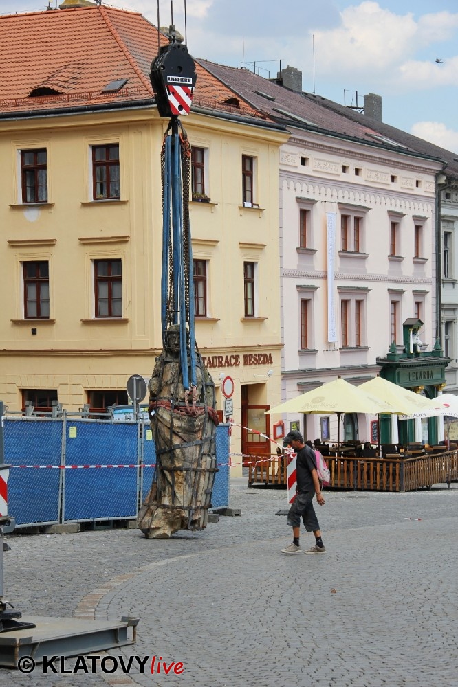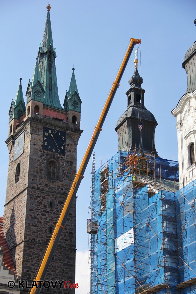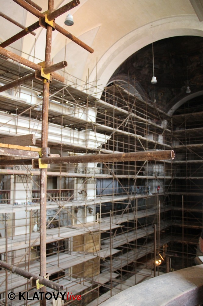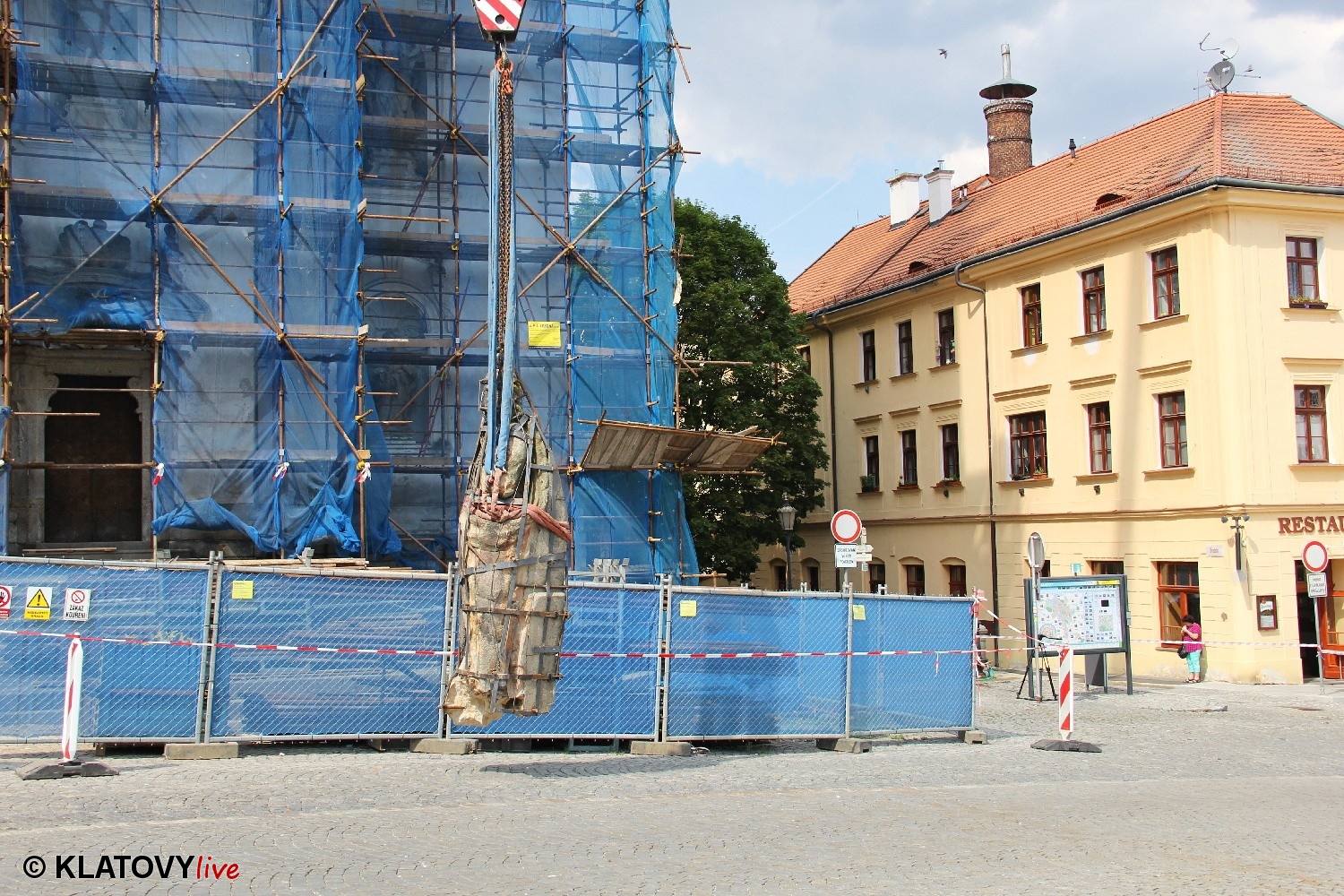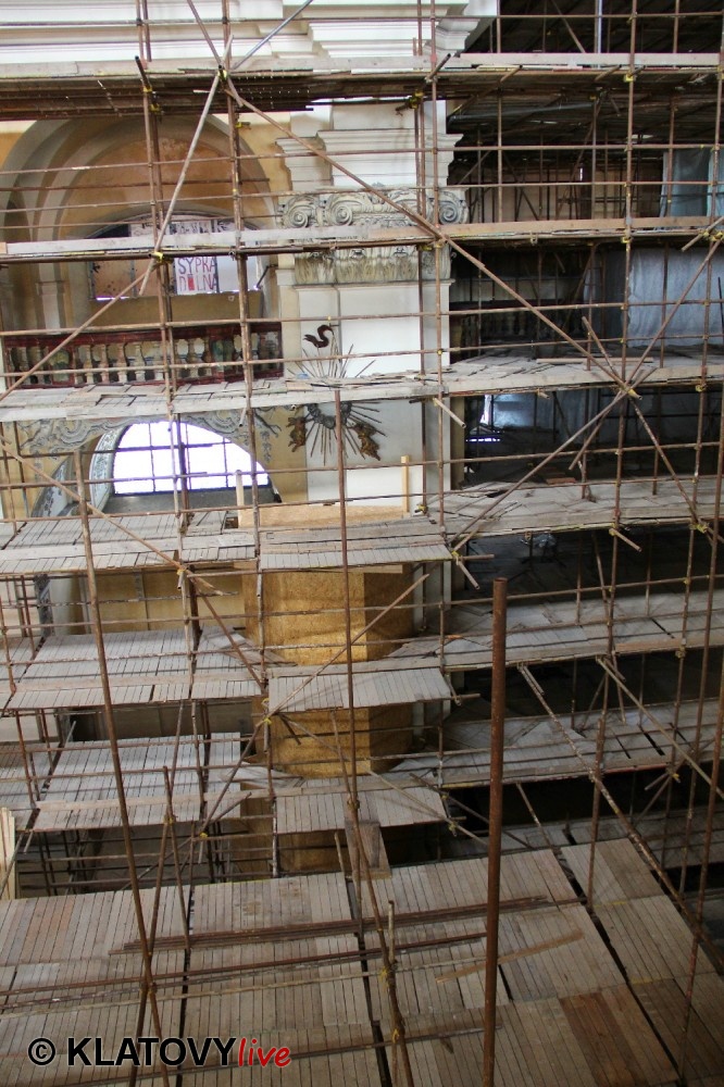 Z průčelí Jezuitského kostela na náměstí Míru v Klatovech byla snesena socha Panny Marie v rámci rekonstrukce kostela. O kompletní rekonstrukci svědčí i fotky lešení v interiéru.