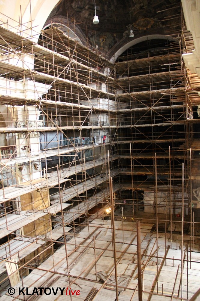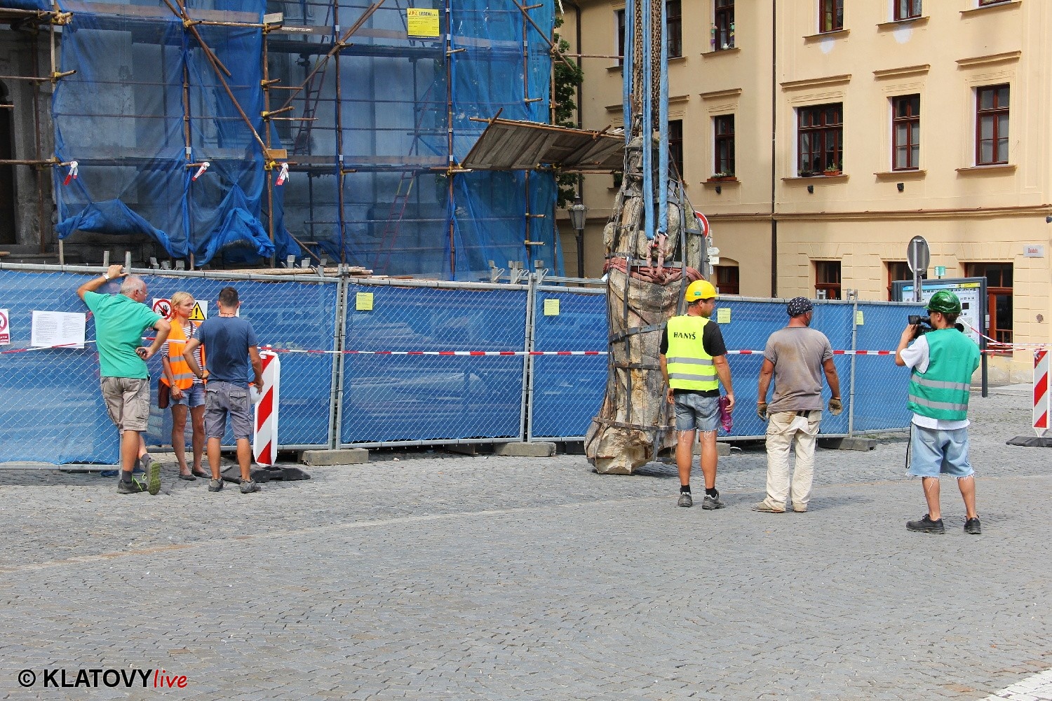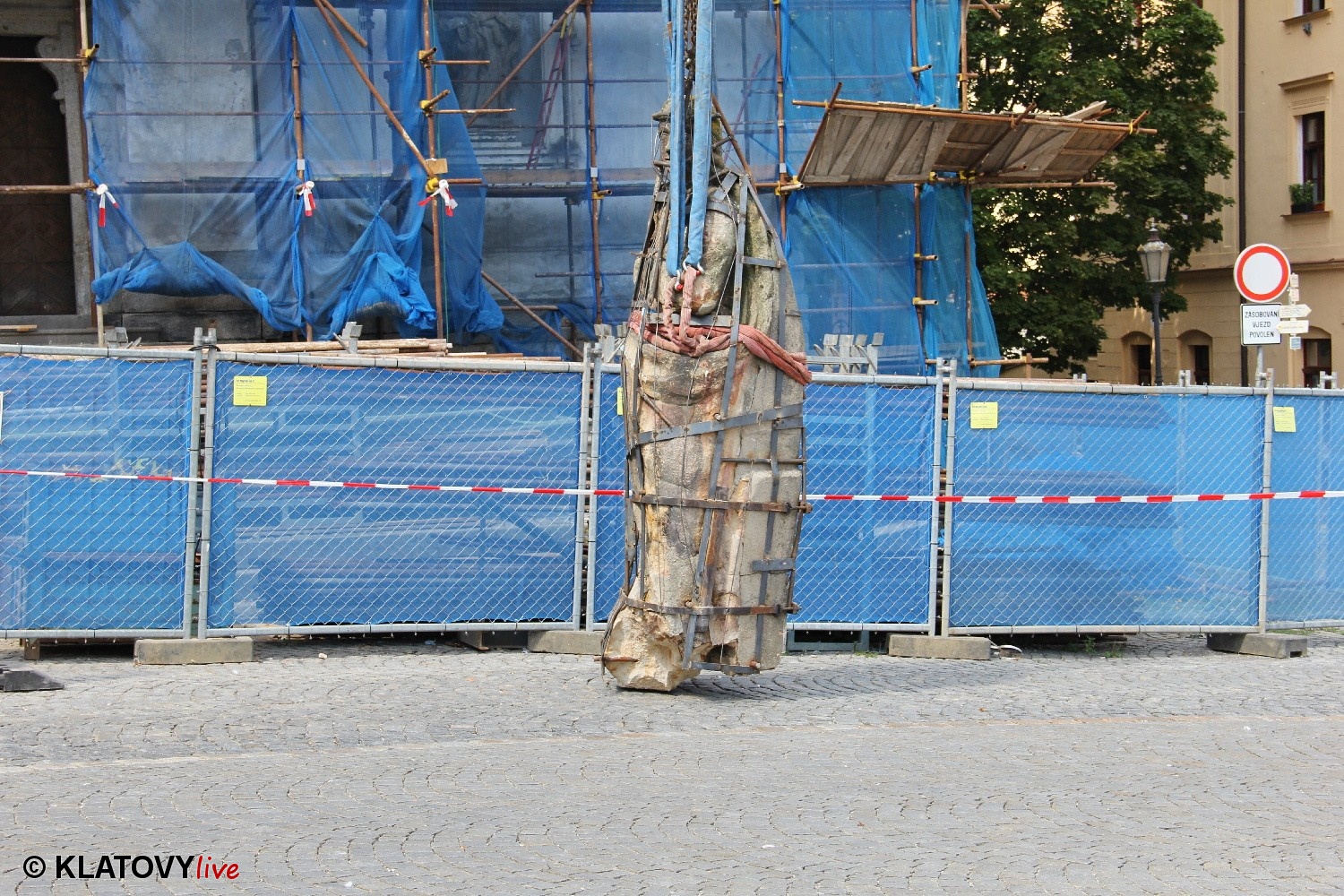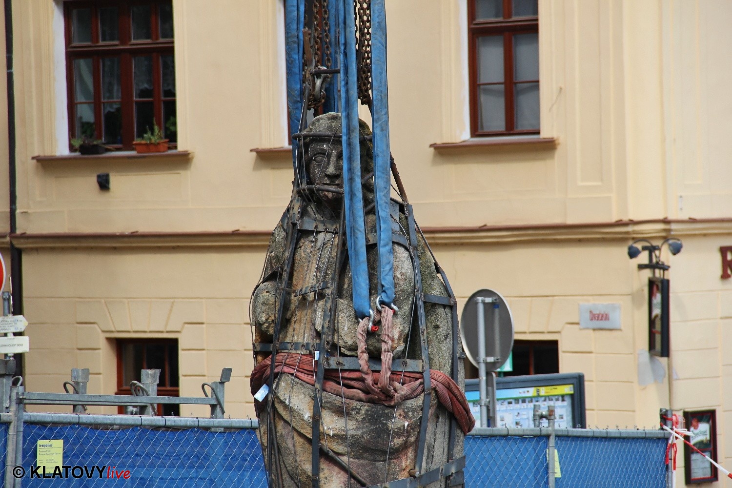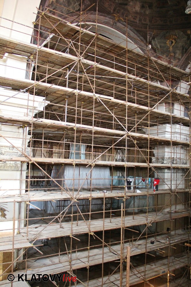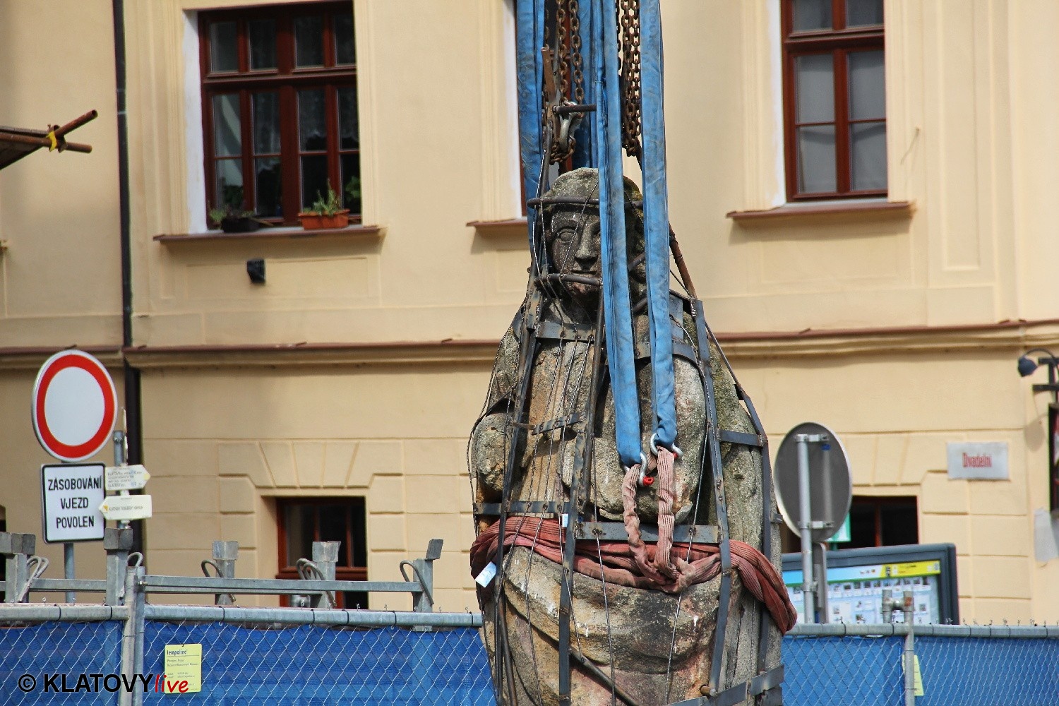 Z průčelí Jezuitského kostela na náměstí Míru v Klatovech byla snesena socha Panny Marie v rámci rekonstrukce kostela. O kompletní rekonstrukci svědčí i fotky lešení v interiéru.