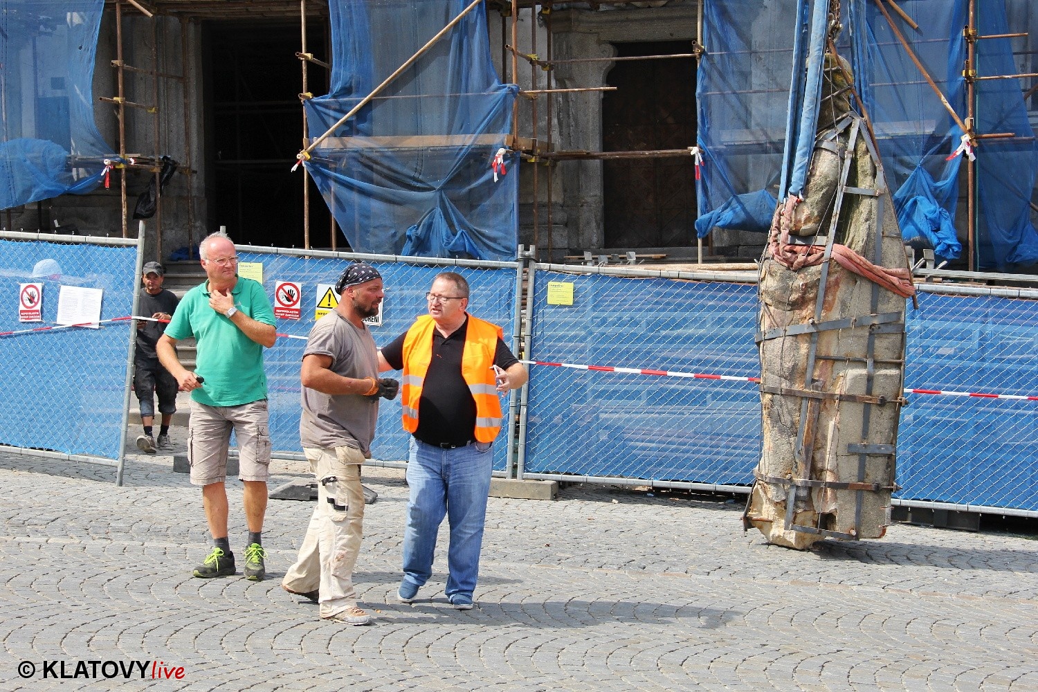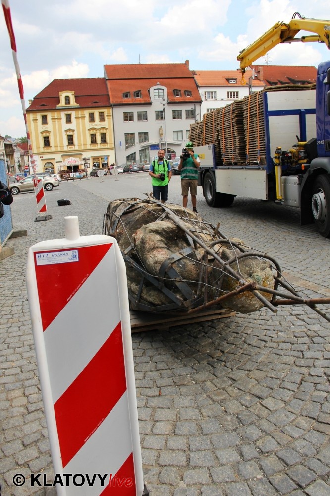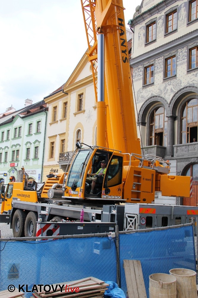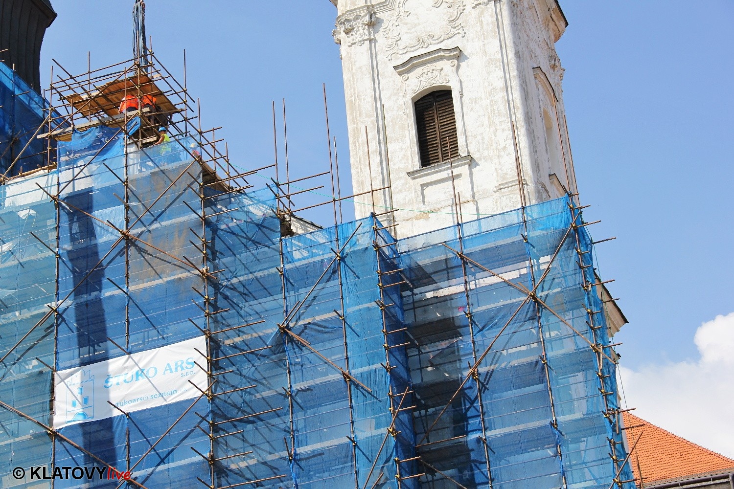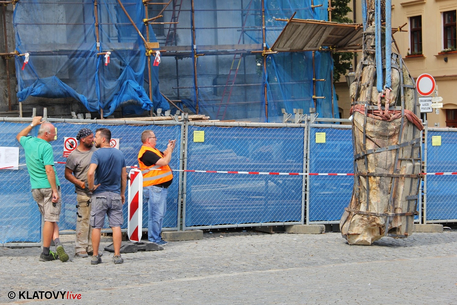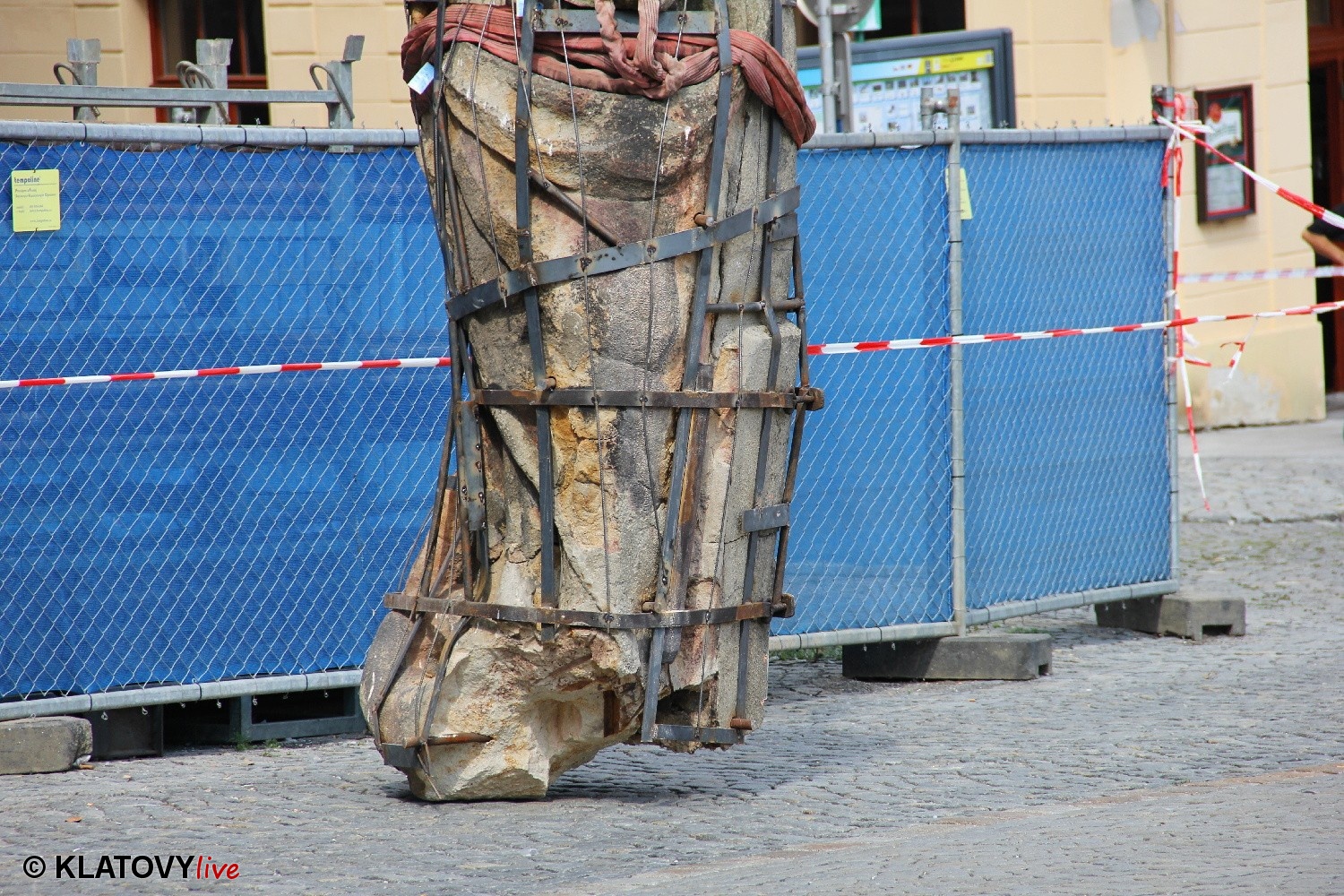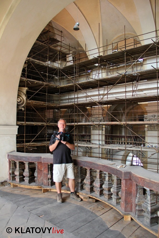 Z průčelí Jezuitského kostela na náměstí Míru v Klatovech byla snesena socha Panny Marie v rámci rekonstrukce kostela. O kompletní rekonstrukci svědčí i fotky lešení v interiéru.