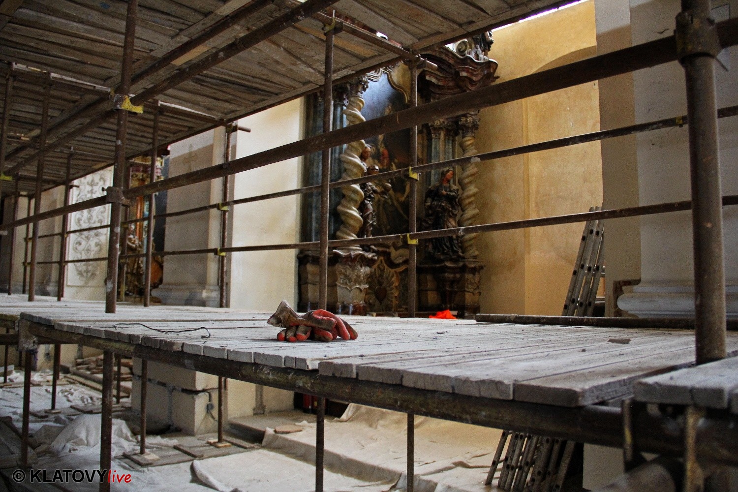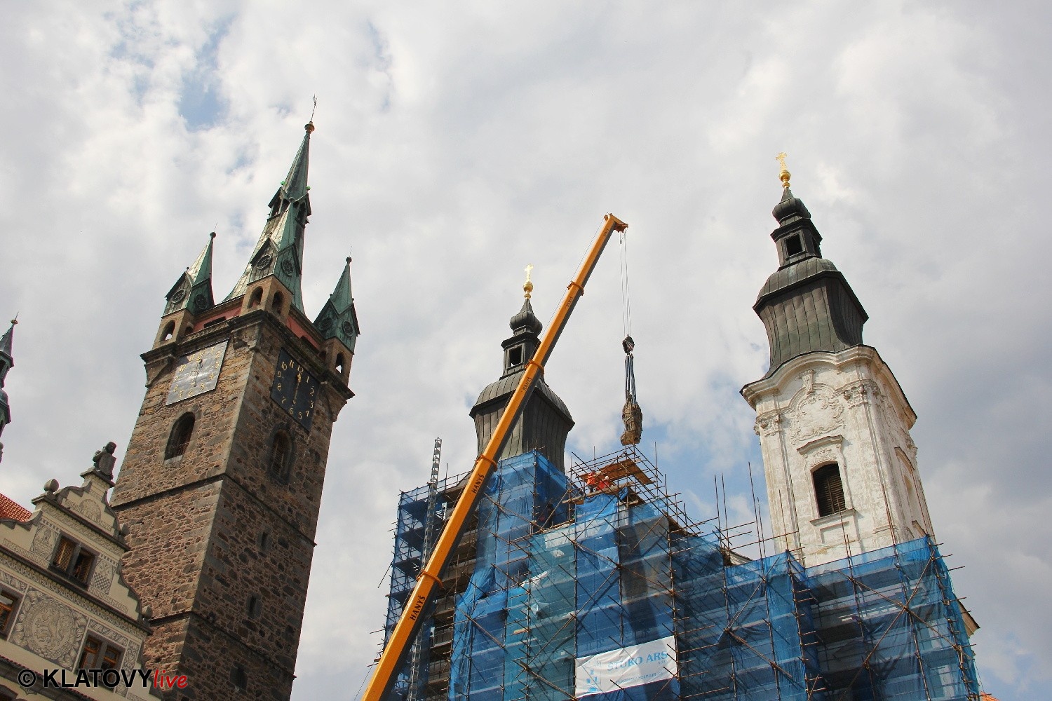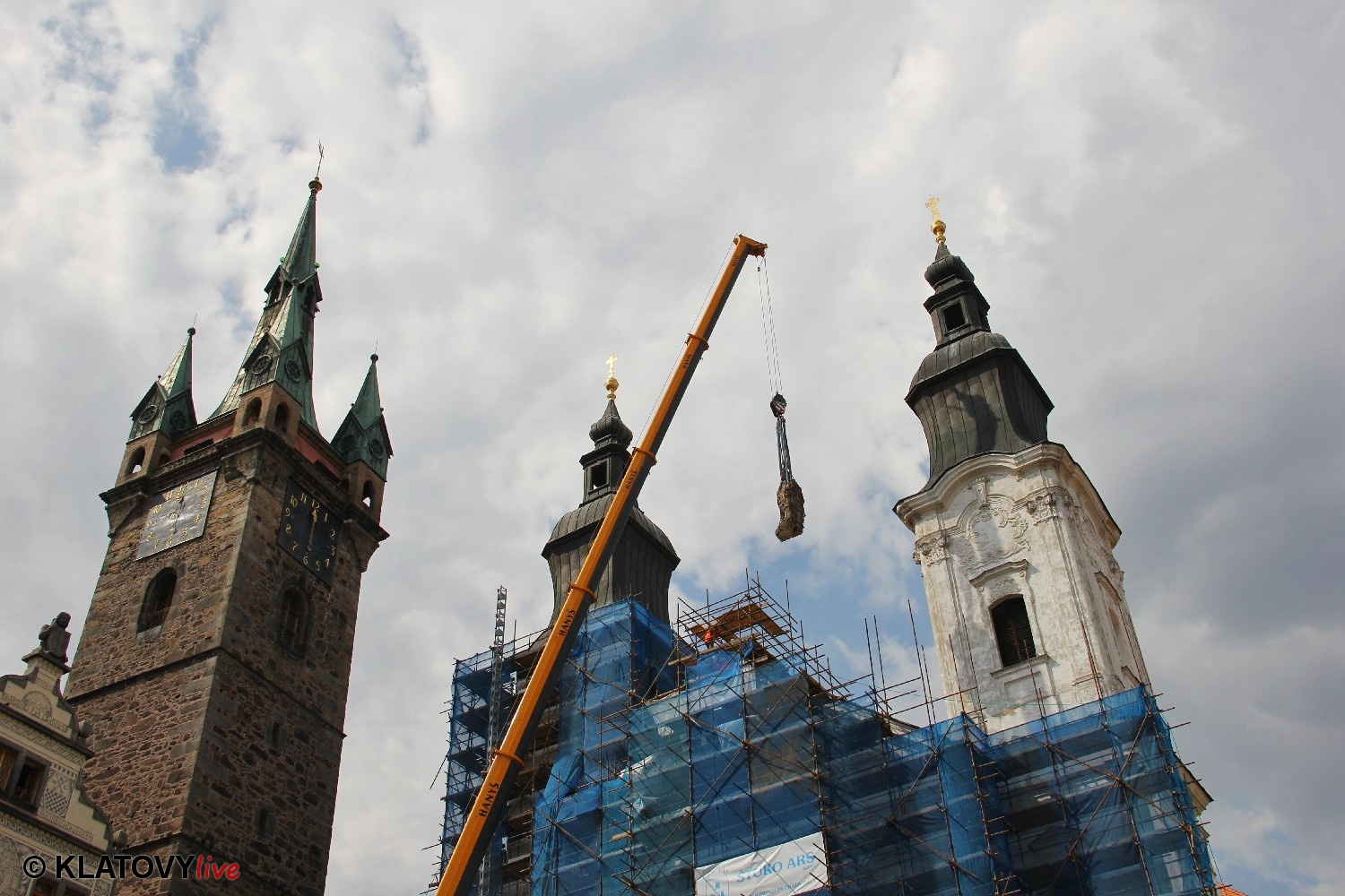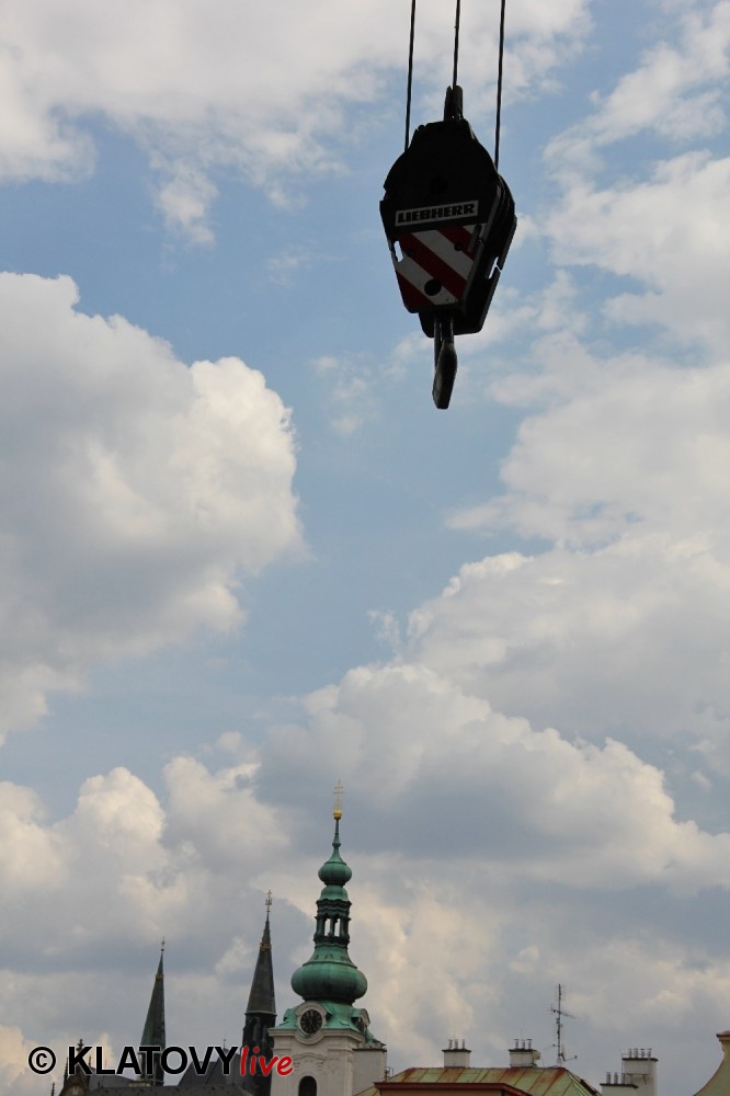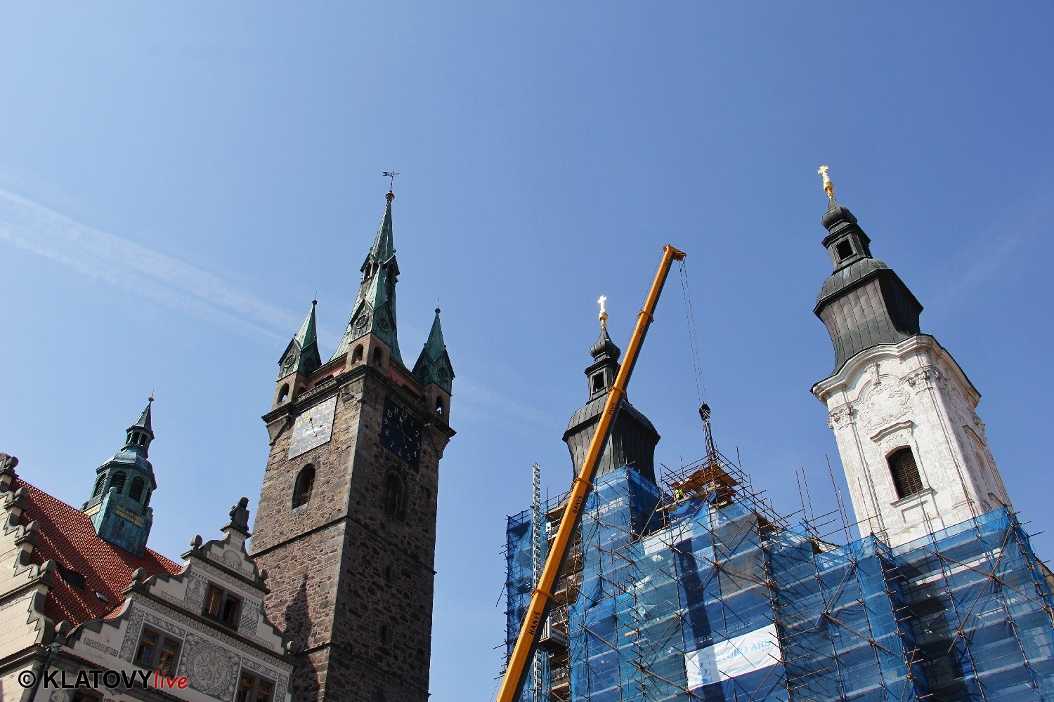 Z průčelí Jezuitského kostela na náměstí Míru v Klatovech byla snesena socha Panny Marie v rámci rekonstrukce kostela. O kompletní rekonstrukci svědčí i fotky lešení v interiéru.