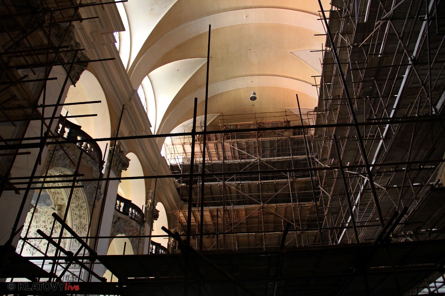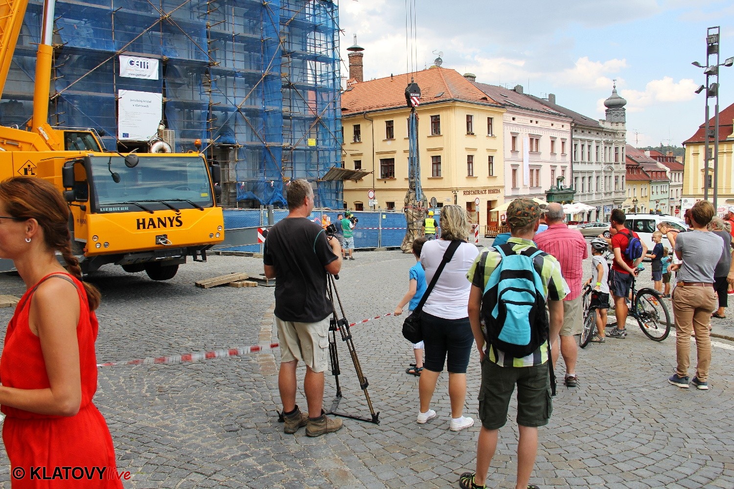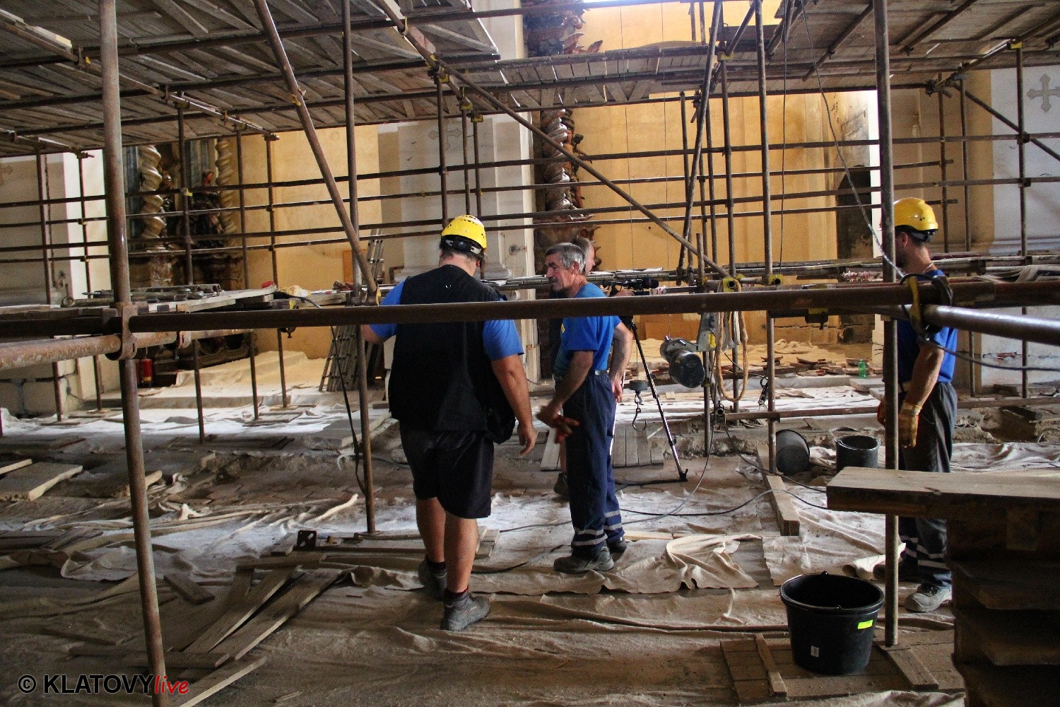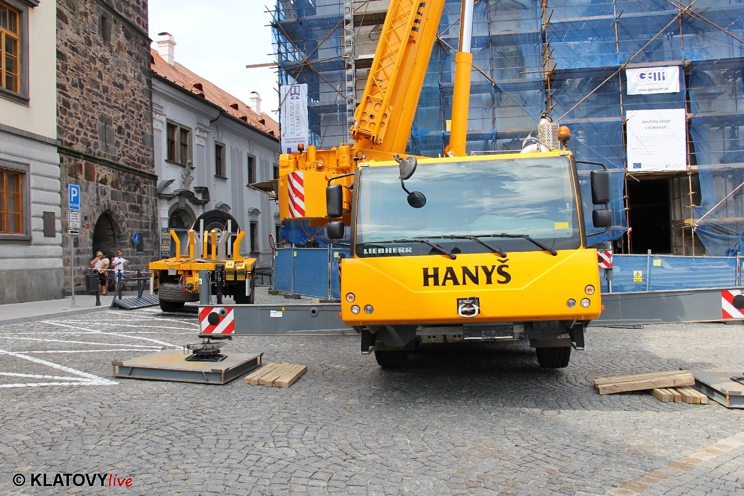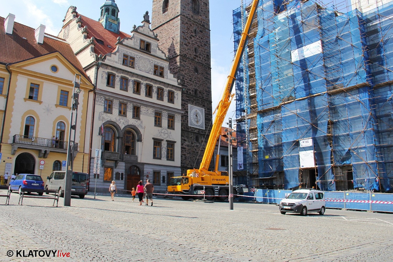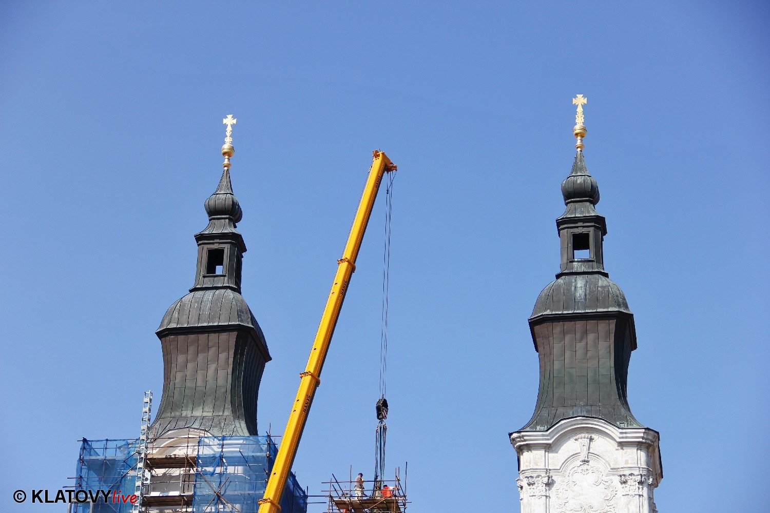 Z průčelí Jezuitského kostela na náměstí Míru v Klatovech byla snesena socha Panny Marie v rámci rekonstrukce kostela. O kompletní rekonstrukci svědčí i fotky lešení v interiéru.