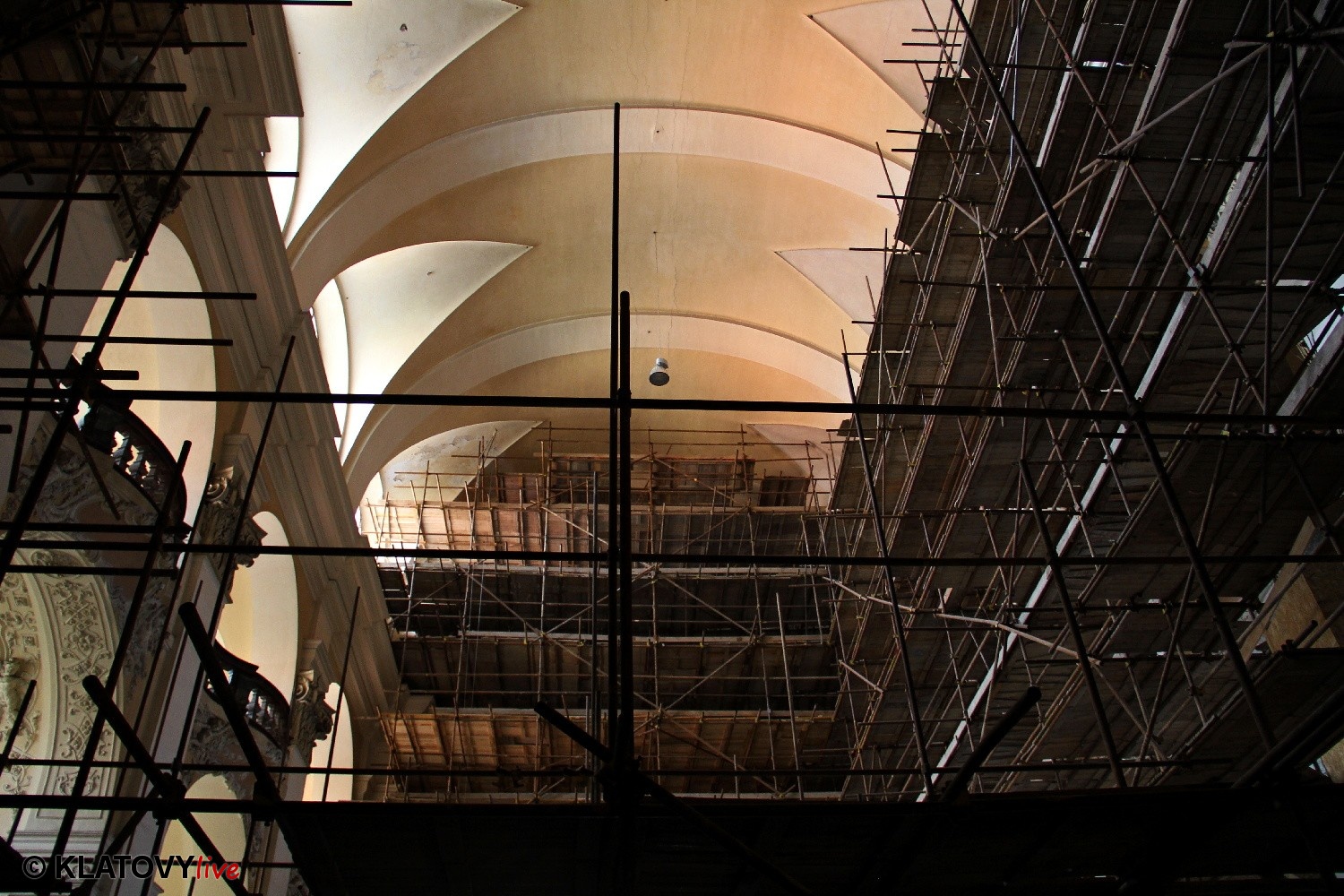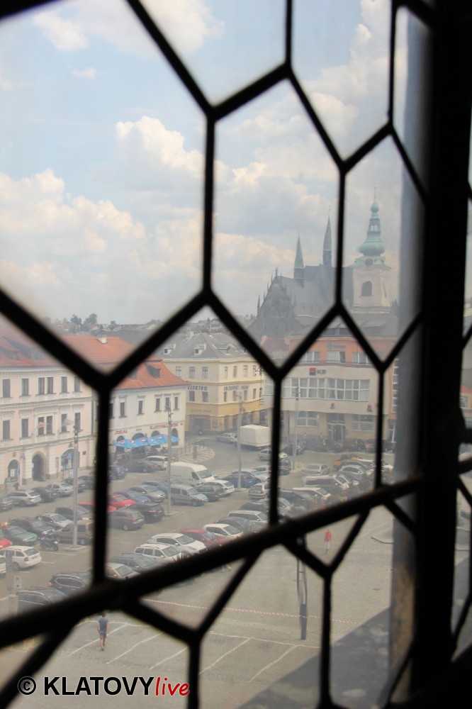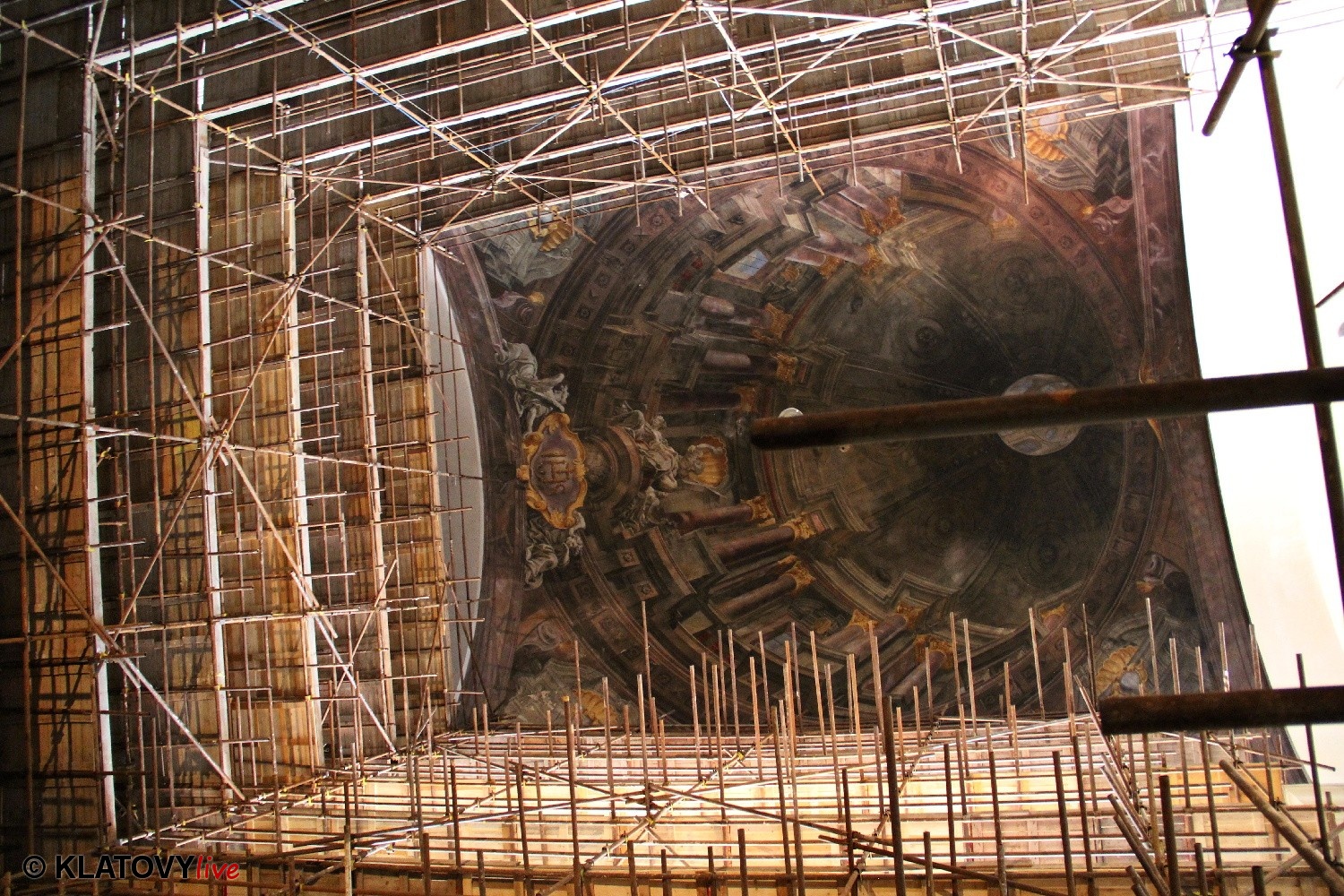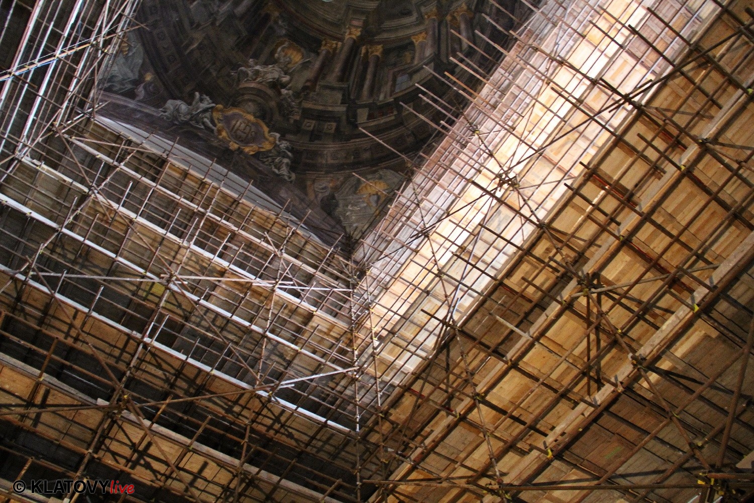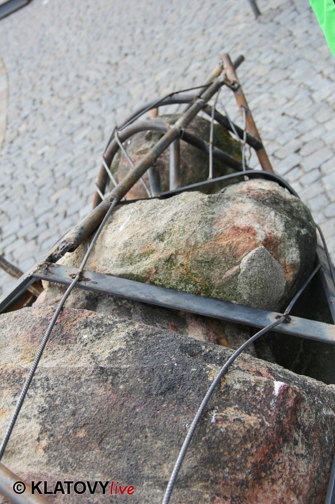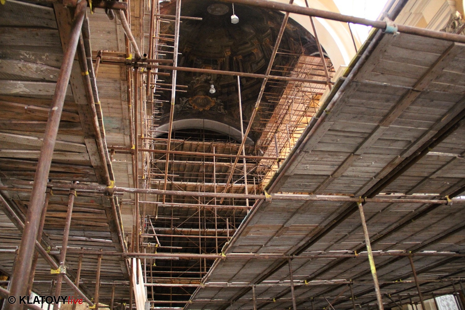 Z průčelí Jezuitského kostela na náměstí Míru v Klatovech byla snesena socha Panny Marie v rámci rekonstrukce kostela. O kompletní rekonstrukci svědčí i fotky lešení v interiéru.
