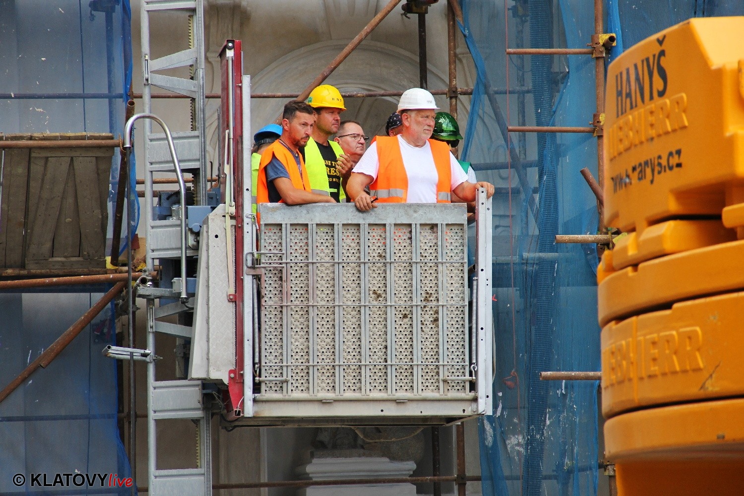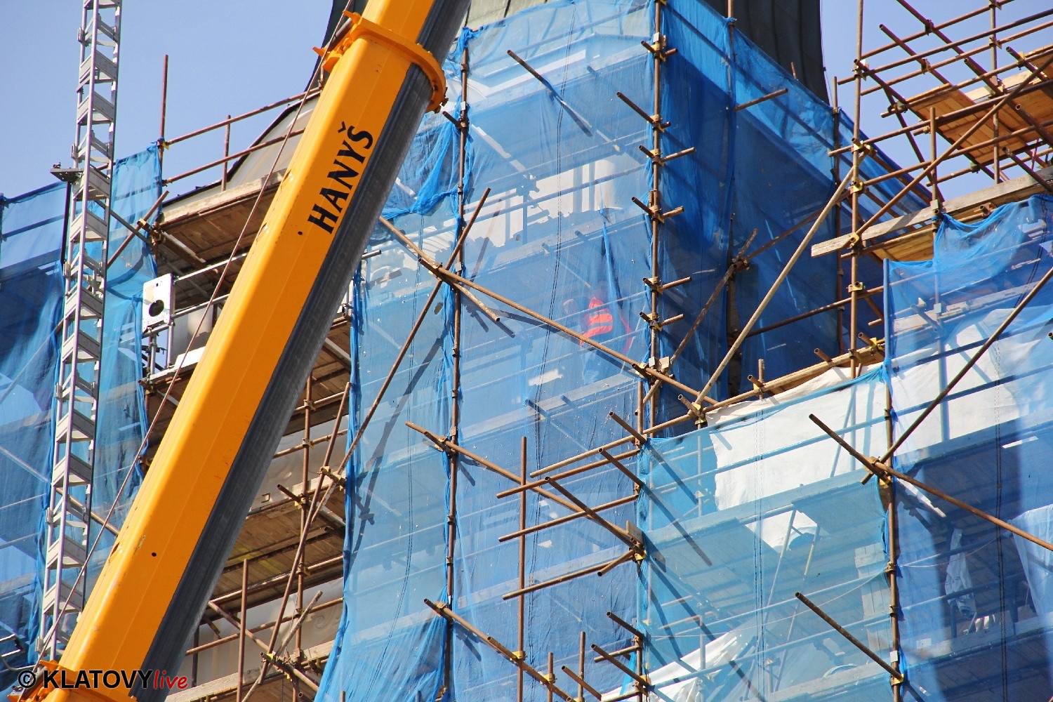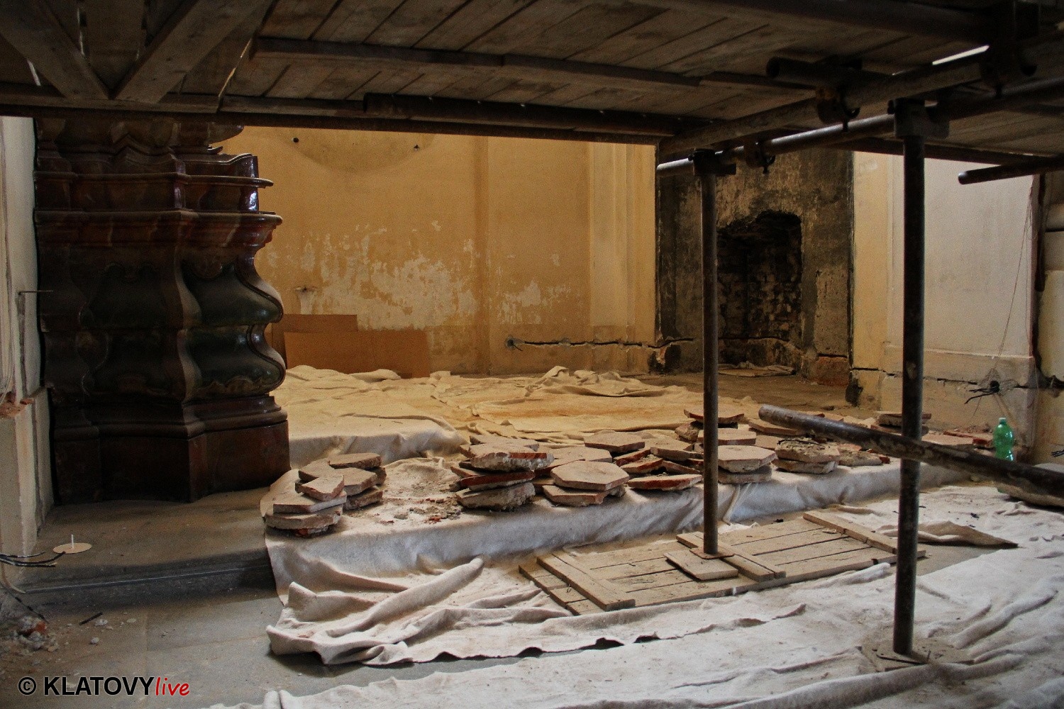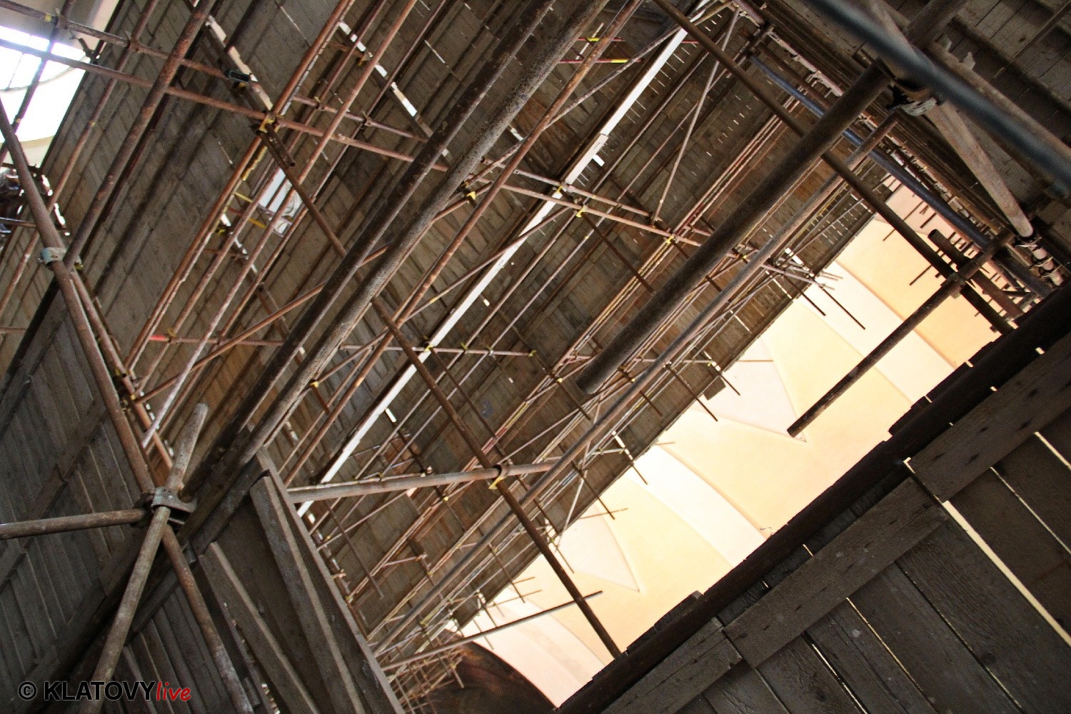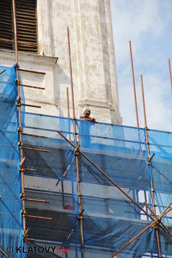Z průčelí Jezuitského kostela na náměstí Míru v Klatovech byla snesena socha Panny Marie v rámci rekonstrukce kostela. O kompletní rekonstrukci svědčí i fotky lešení v interiéru.
