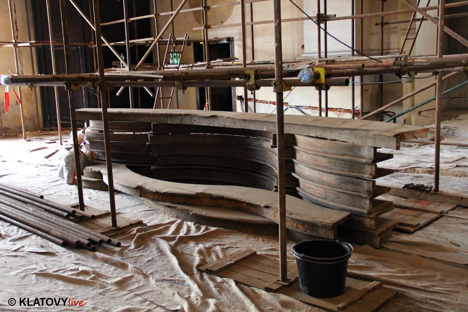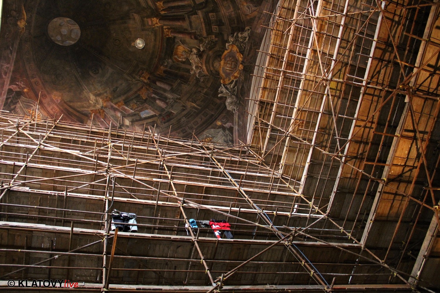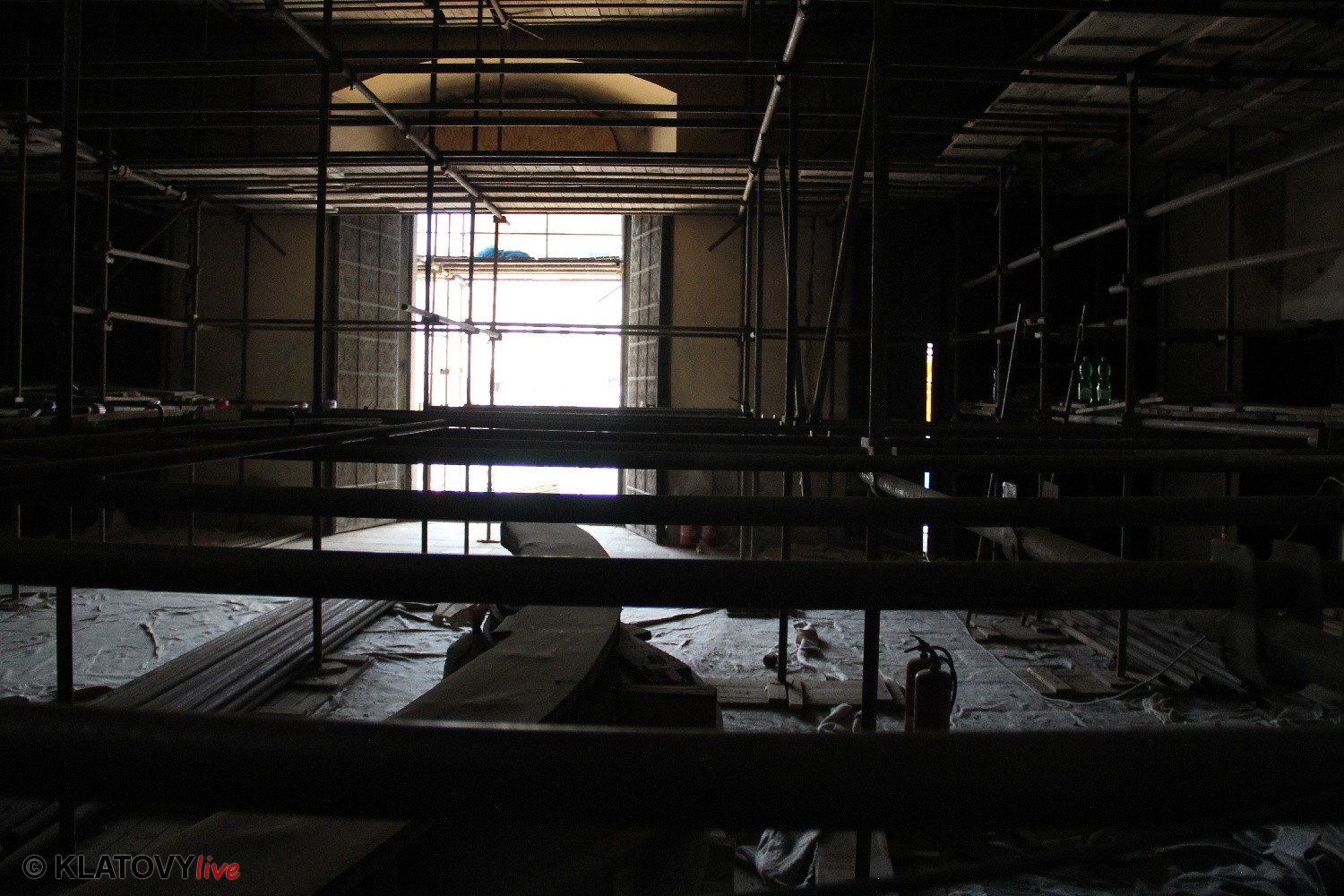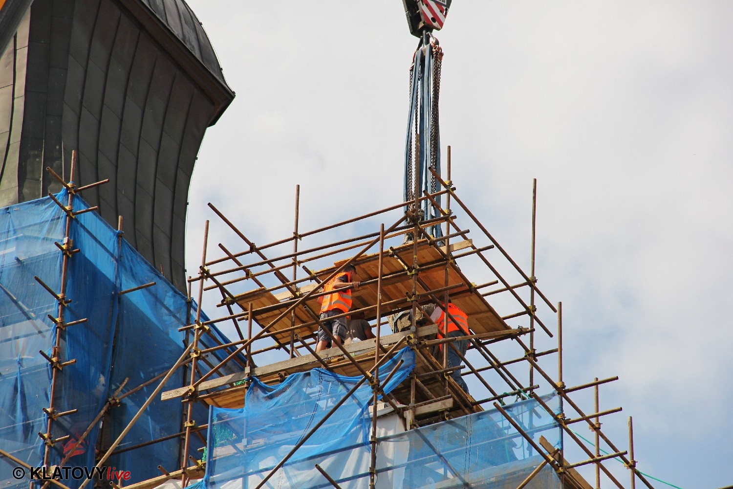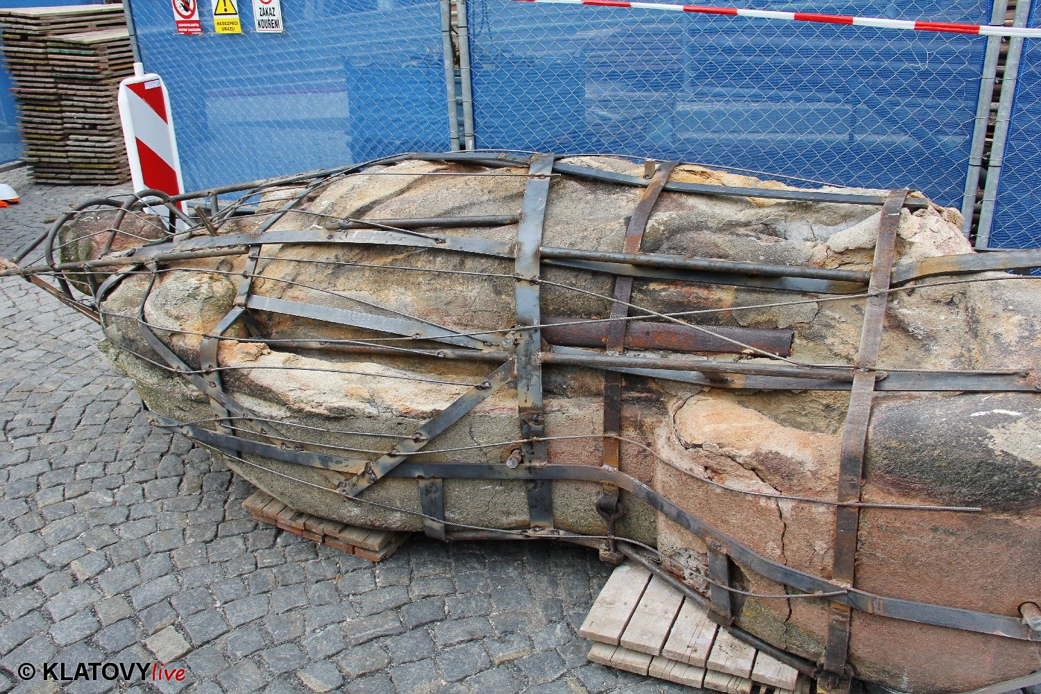 Z průčelí Jezuitského kostela na náměstí Míru v Klatovech byla snesena socha Panny Marie v rámci rekonstrukce kostela. O kompletní rekonstrukci svědčí i fotky lešení v interiéru.